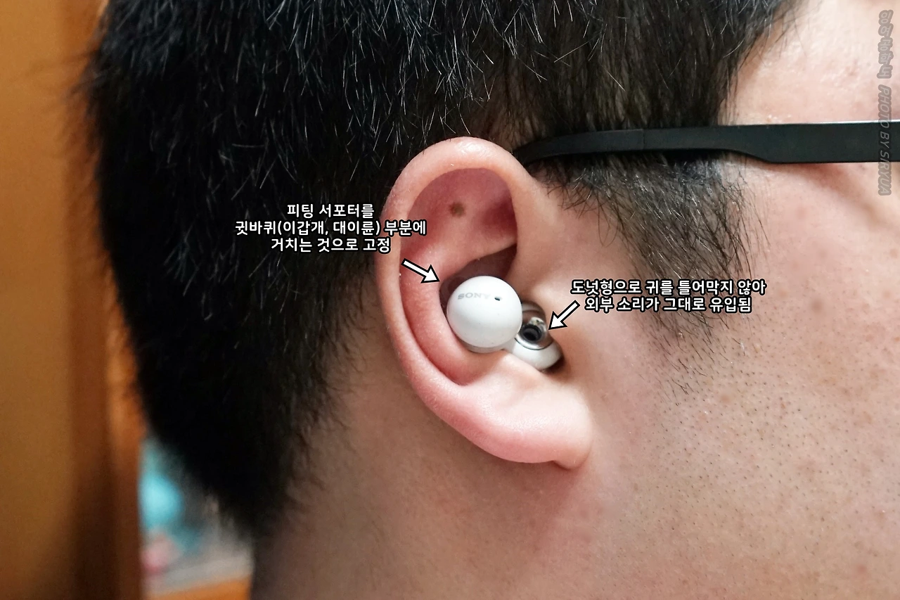 착용은 도넛 형태의 드라이버를 귓구멍 속으로 넣어서 이주 쪽에 거치하고, 피팅 서포터를 이갑개, 대이륜 등 귓바퀴 쪽에 거치하는 형태입니다. 착용감이 생각했었던 것보다 훨씬 준수하고 가볍게 걸어두고 있는 느낌이라서 매우 괜찮았는데요, 배터리가 100%에서 완전히 방전될 때까지 다섯 시간 넘게 꽤 오랜 시간 동안 착용해도 부담스럽지 않았습니다.