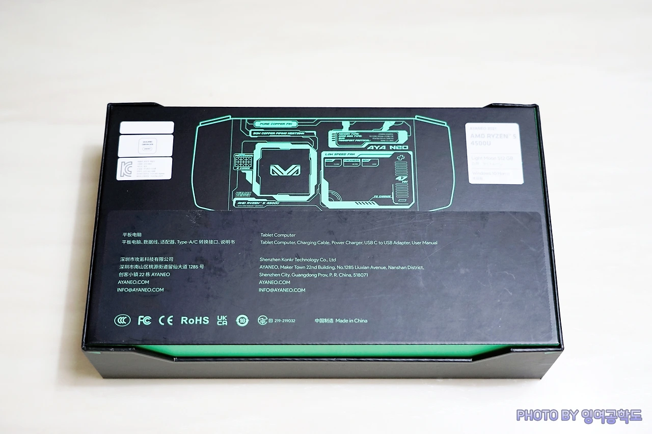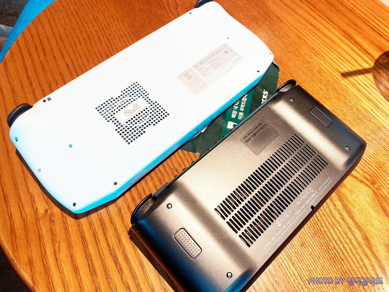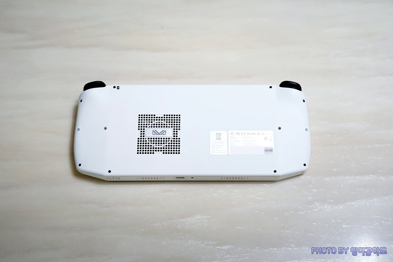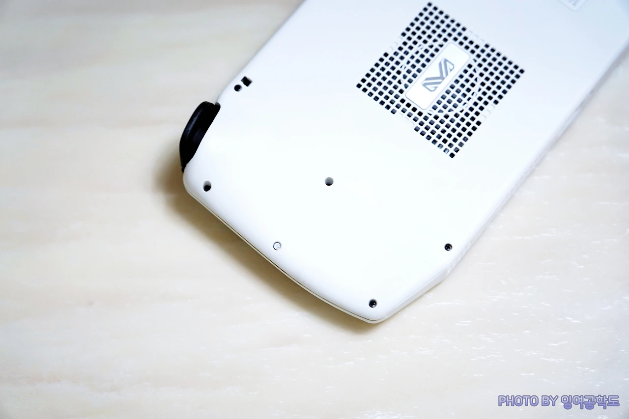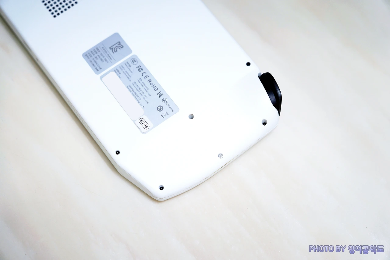 뒷면은 쿨링팬이 공기를 흡입하는 흡기구와 제품의 인증 정보와 사양을 표기한 스티커를 제외하면 아무것도 없이 결합 나사만 가득합니다. 심플하고 깔끔한 것이 나름 괜찮다고 생각되기도 하지만, 적어도 본체를 세워둘 수 있는 스탠드 다리라도 하나 있었으면 더 좋았을 것 같다는 생각이 참 많이 듭니다. 이러나저러나 기본 베이스 자체는 PC이기 때문에 조이스틱 이외에도 블루투스나 유선 연결을 통해 키보드와 마우스를 연결해서 사용하는 경우도 분명히 있을 것인데.. 이런 부분에 대해 전혀 고려를 하지 않았다고 생각합니다. 물론, 디스플레이 터치와 가상 키보드, 그리고 조이스틱을 통해 충분히 OS 입력 제어를 할 수 있습니다. 하지만, 사용해보면 확실하게 느껴지는 점이 정말 갑갑해서 따로 연결해서 로그인, 옵션 설정 등을 진행하는 경우가 더 많습니다. 특히, 키보드와 마우스에 더 익숙한 저와 비슷한 세대는 더더욱 말이지요. 뒤에 보다 상세하게 후술 하겠지만, 비슷한 시기에 출시된 GPD 제품과 비교해보면 확실하게 이 제품군에 대한 경험이 부족했다는 점이 여과 없이 느껴진 요소라 생각합니다.