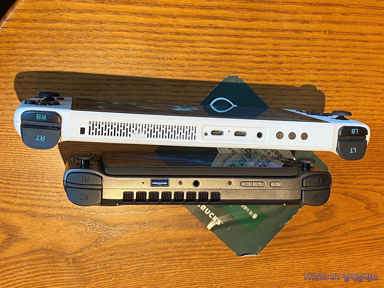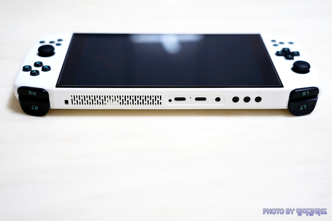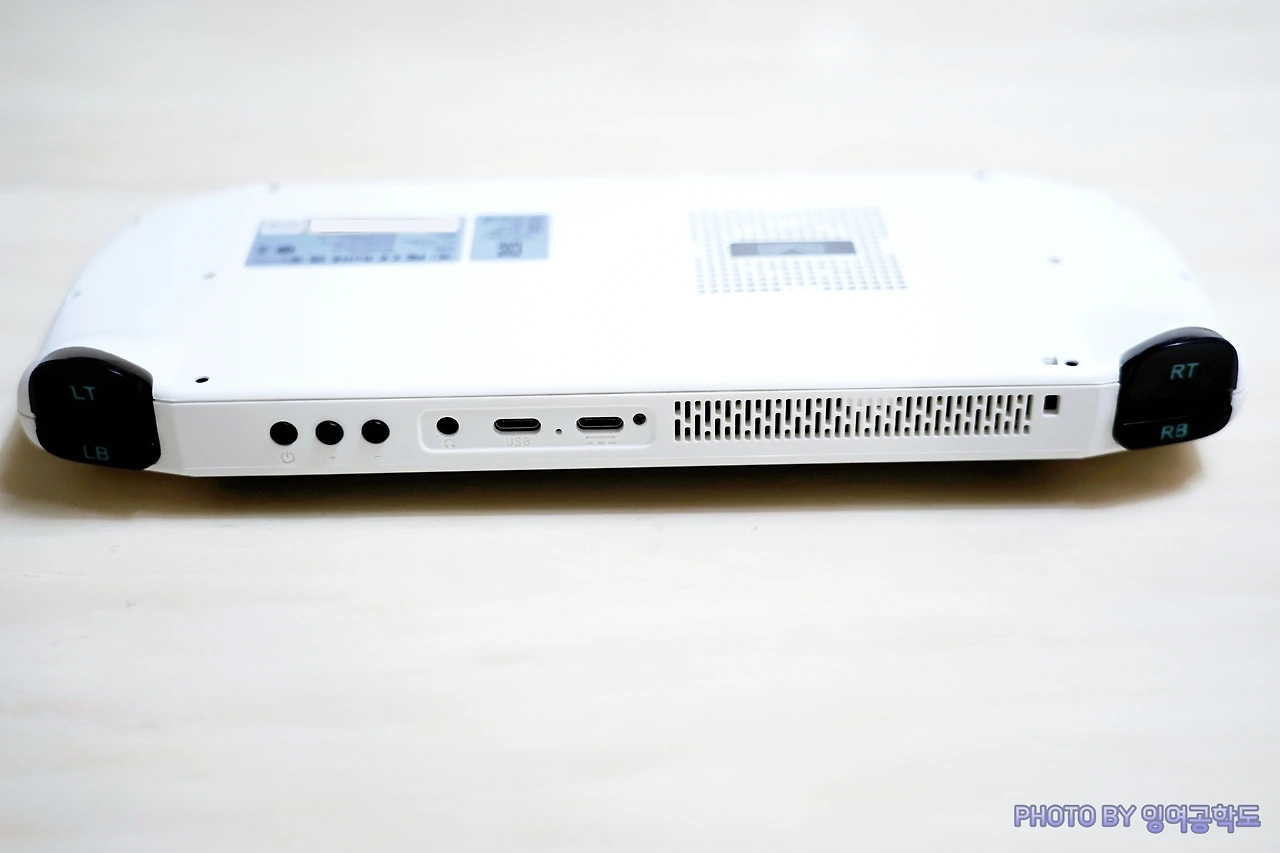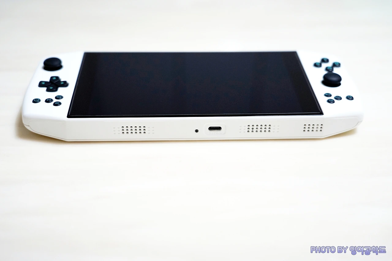 본체의 상단에는 USB C 포트 두 개, 3.5 파이 오디오 단자, 그리고 전원과 볼륨 버튼이 위치하고 있으며, 하단에는 USB C 포트 한 개와 스테레오 스피커와 공기 흡기가 위치하고 있습니다. 일단 USB-C 포트 같은 경우 상단에 DC 전원 표기가 있는 포트 하나와 하단에 위치하고 있는 포트가 USB-PD 충전을 지원합니다. 게임을 하다 보면 자세와 충전 어댑터의 위치에 따라 충전 선의 위치가 바뀌었으면 하는 경우가 종종 발생하는데요, 상/하단 각각 충전을 지원한다는 점은 선이 불편하게 하는 경우를 최소화시킬 수 있어서 큰 장점 중 하나라 생각합니다. 그리고 스테레오 스피커 같은 경우, 좌우 균등하게 분배되어있어 나름 괜찮다고 생각되기는 하지만, 아쉽게 다가오는 부분입니다. 오른쪽에 공기 흡기가 하나 더 있어 소리가 오른쪽으로 조금 치우쳤다고 해야 될까요? 우측으로 새는 느낌이 조금 들고 있습니다. 그리고 하단에만 위치하고 있다 보니 어쩔 수 없이 사용자 입장에서는 책상 위에 올려두고 할 경우 한 번은 부딪힌 소리를 듣게 될 수밖에 없어서 상단에도 스피커가 배치되어 있었으면 더 좋지 않았을까 싶습니다.
