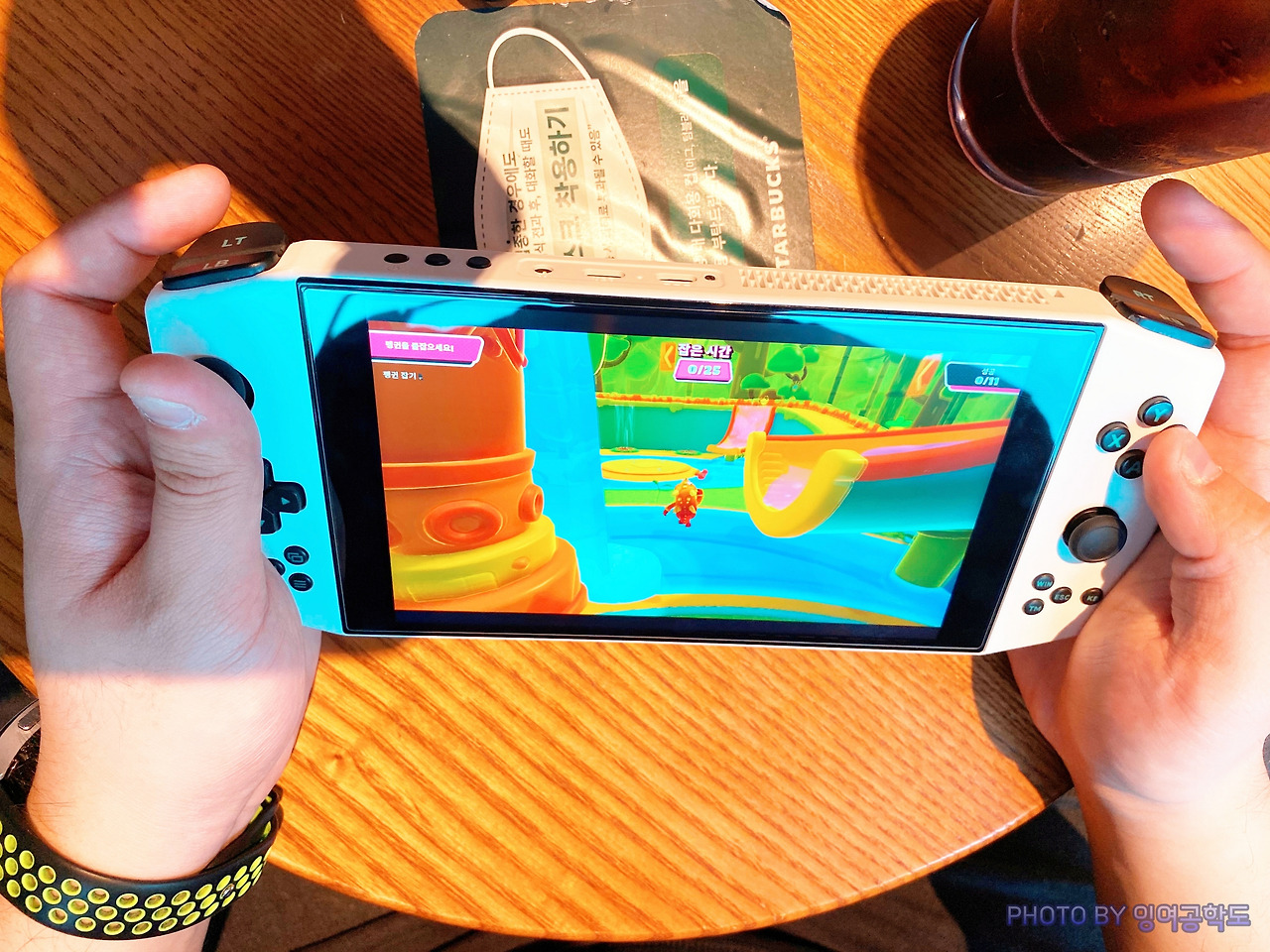게임 성능에서는 R5 4500U가 보급형 APU라서 성능이 부족하여 무리가 있을 것 같다는 생각이 들 수도 있습니다. 다만, 아야네오 2021은 1280 x 720 px 해상도를 가지고 있는 7 인치 디스플레이를 사용합니다. 즉, 우리가 사용하고 있는 일반적인 PC 해상도인 FHD와 비교해서 4분의 1 수준의 해상도를 사용하고 있어, 매 순간 처리하는 그래픽 랜더링 양이 분명하게 적습니다. 그리고 PC 기준으로 매우 작은 디스플레이라서 낮은 해상도에서도 게임 플레이에 전혀 문제 될 것이 없고요. 이에 따라 UMPC 커뮤니티를 조금만 찾아보아도 높은 사양을 요구하는 게임을 문제없이 플레이 한 사례를 찾아볼 수 있습니다. 그리고, 가지고 있는 게임 중에서 FPS 장르를 제외하고 그나마 높은 사양을 요구하는 게임(소울워커, 폴 가이즈, GTA5 등)을 잠깐 몇 개 해본 결과 충분히 문제없이 즐길 수 있었습니다. 대신 요구 사양이 높아진 만큼 전력 소모가 빨랐고 쿨러가 매우 빠르게 돌아갔지만요. 고로, 정리를 조금 해보자면 가벼운 게임은 꽤 오랜 시간 동안 플레이할 수 있고, 높은 사양을 요구하는 게임은 그만큼 휴대하면서 할 수 있는 시간이 줄어든다고 보면 될 것 같습니다.