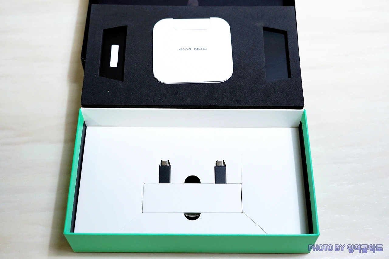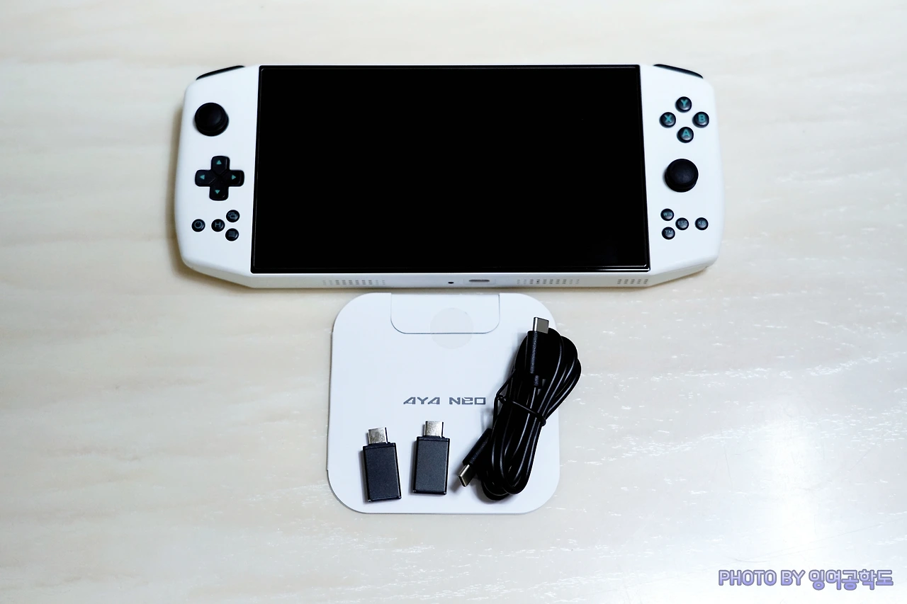 화려한 박스 속에 담겨있는 구성은 매우 소박합니다. 아야네오 본체와 함께 2 개의 USB A to C 변환 젠더와 C to C 케이블 하나, 그리고 간단한 사용 설명서로 이루어져 있습니다. 충전이 USB-PD 규격으로 이루어지기 때문에 별도의 충전기가 동봉되어 있지 않아도 크게 문제는 없지만, 아예 구성에서 빠져있는 점은 조금 아쉽게 생각됩니다. 환경을 생각해서 없어도 굳이 상관없지만 그래도 잘 챙겨주는 게임기를 여럿 봤기 때문에 조금 그렇습니다. 그리고 보면서 잠깐 스쳐 지나간 생각이지만, 사용 설명서를 모서리 곡률 진 종이에 넣어 주는 것이 꼭 애플의 전매특허가 아니기는 하지만, 꽤 많이 참고한 것 같아 보이기는 합니다.