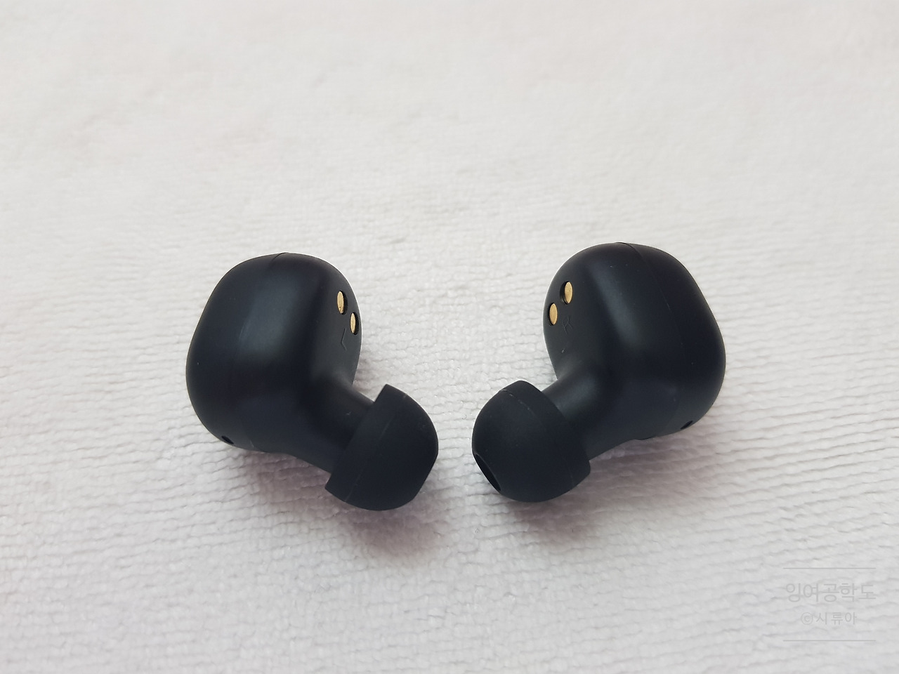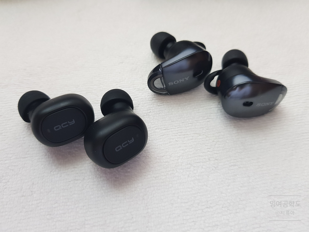 블로그 댓글로 제가 메인으로 사용하고 있는 WF-1000X와의 비교도 해주었으면 요청이 있어서 간단하게나마 비교해보았습니다. 제품 크기 자체는 QCY-T1이 WF-1000X에 비해서 확실히 작습니다. 하지만 착용감은 두 제품 다 큰 차이 없이 비슷하다는 느낌을 많이 받았습니다.