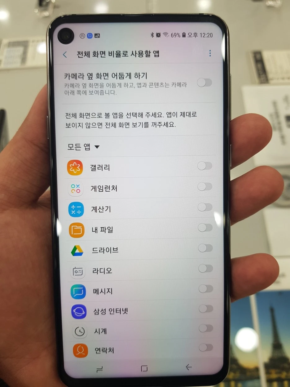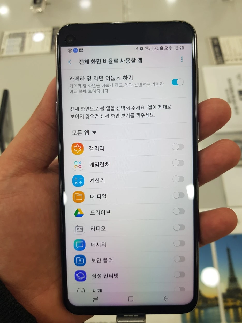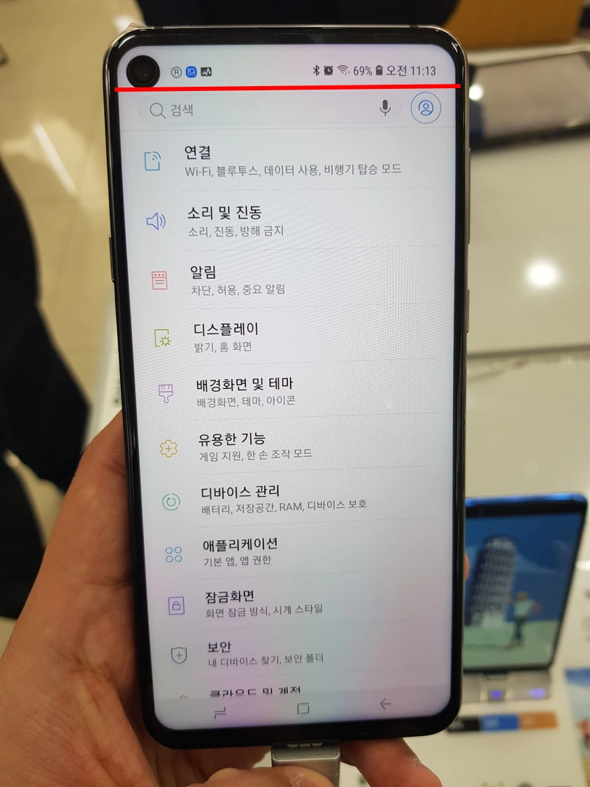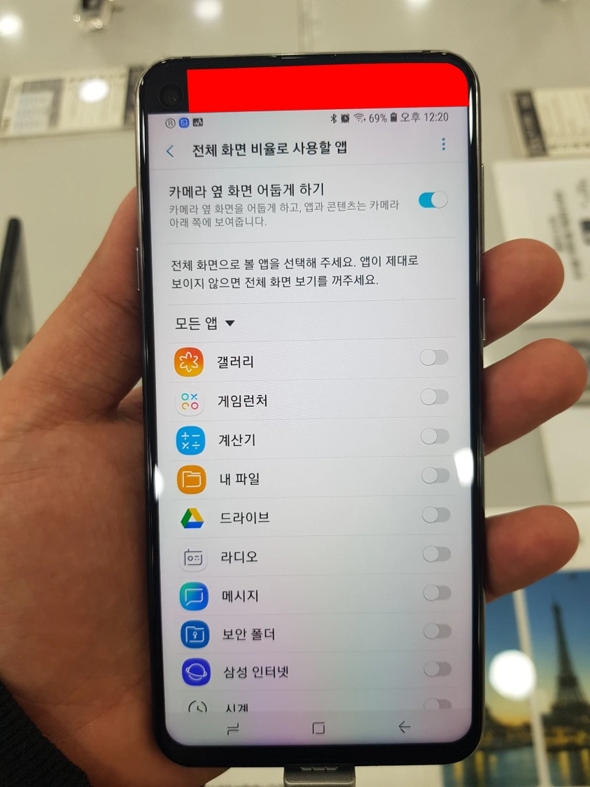 홀 디스플레이 역시 노치 디스플레이와 마찬가지로 잘려나가는 부분 주변을 검은색으로 가리는 옵션이 있습니다. 이를 활성화시킬 경우 카메라 옆 전부가 검은색으로 바뀌며, 그 밑으로 상단 바가 일반 사이즈로 변경되어서 나타나게 됩니다.