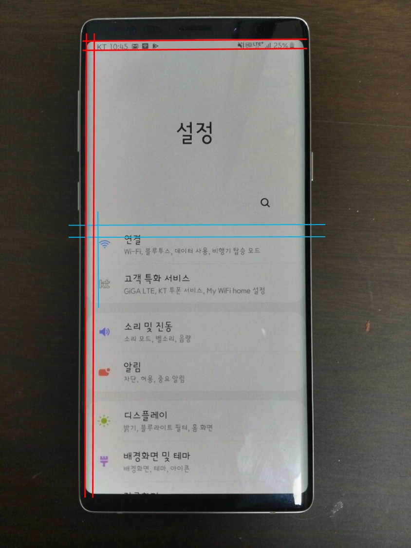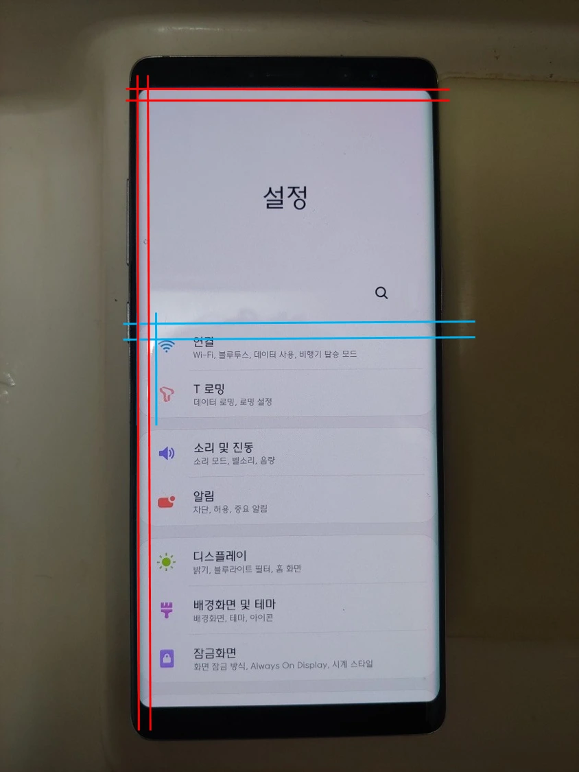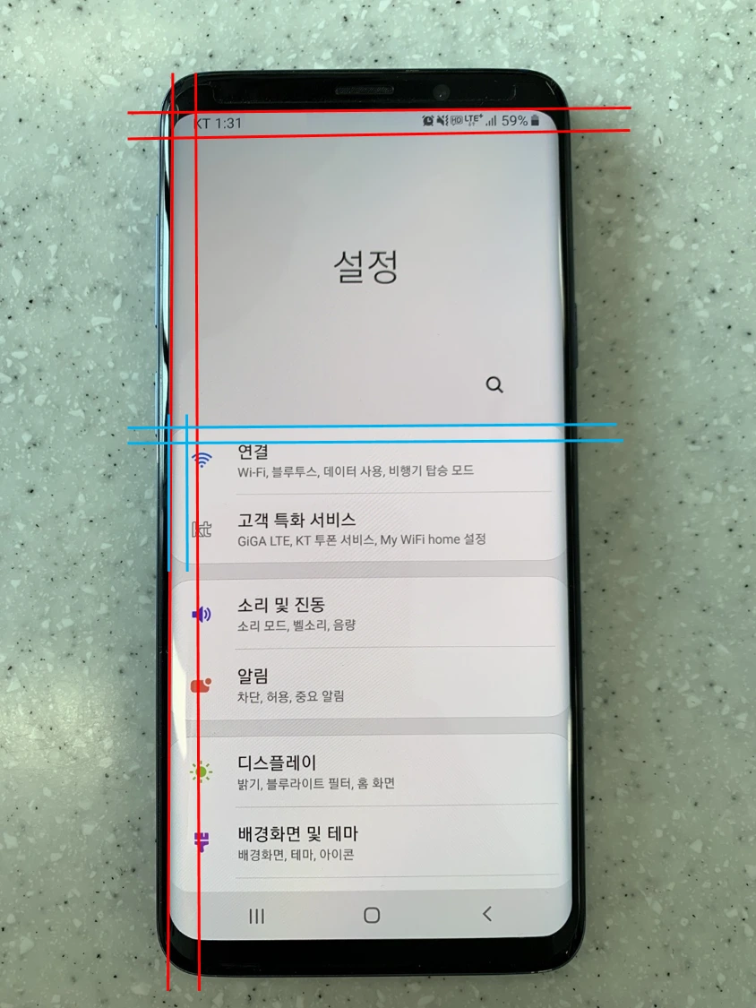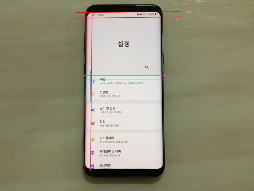 디스플레이 모서리의 곡률과 인터페이스 상의 곡률을 비교해보면, 서로 비슷한 비율로 되어있는 것 같지만 인터페이스 상의 곡률이 다소 작은 것을 볼 수 있습니다.