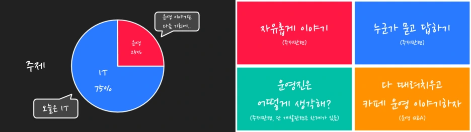 최종적으로 참여해주시는 분들까지 확정되고 난 다음에는 참여하는 운영진들을 모아서 어떻게 진행할 것인지 설명하면서 다 같이 PPT를 만들고, 점검해서 준비를 끝마쳤습니다.