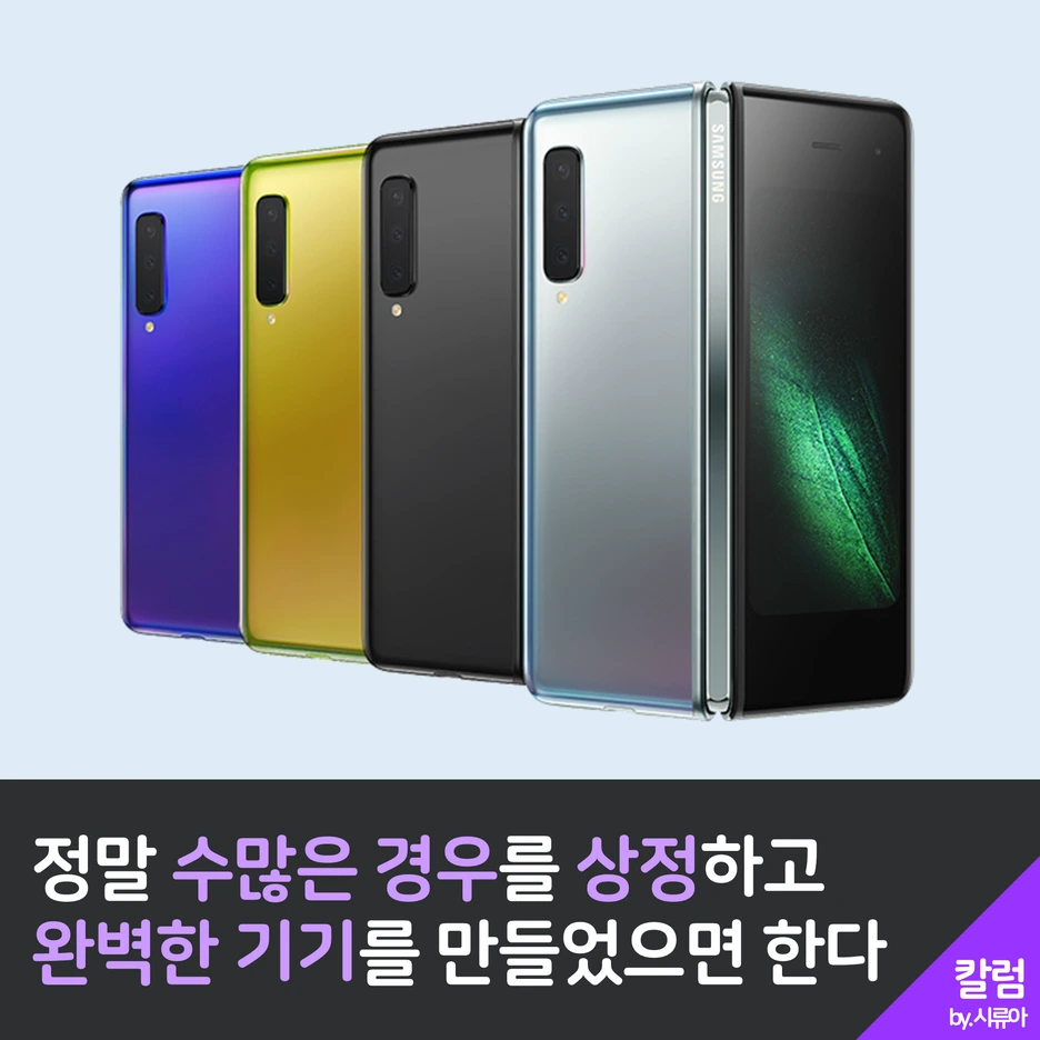 유튜브에서 폴드 관련 영상들을 보다가 우연치 않게 보게 된 국내 유튜버 분의 영상에서 기계 장치적 요소는 사용자가 정말 어떻게 쓸지 모르기 때문에 정말 수많은 경우의 수를 상정해놓고 하드코어 하게 테스트해보아야 된다는 이야기를 하셨는데 이 말에 매우 공감했습니다.
