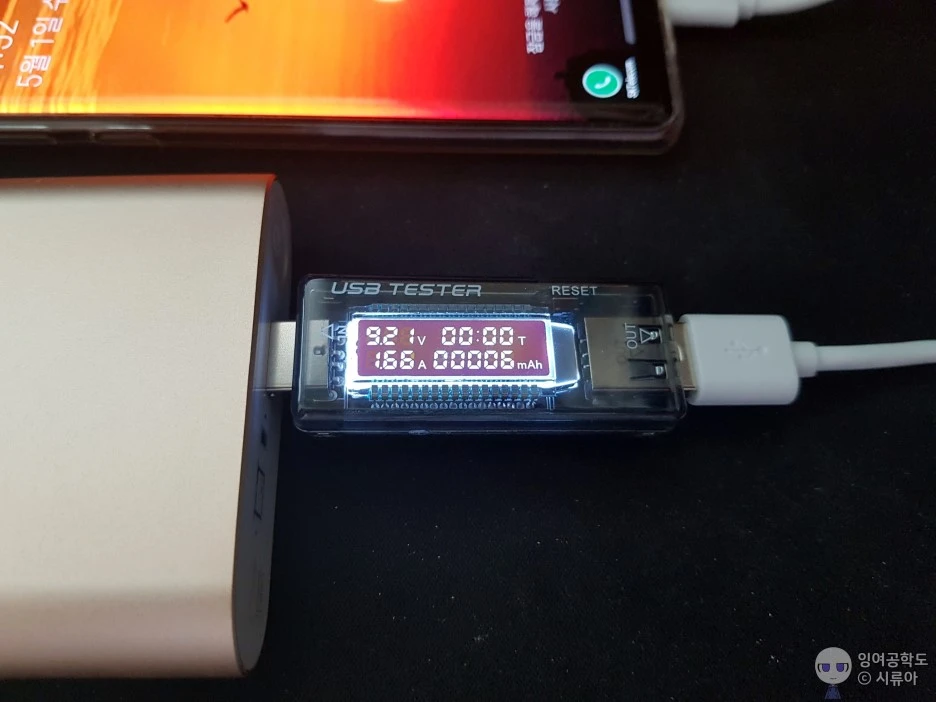 USB 테스트기로 측정 가능한 QC3.0을 확인해보니 9.21V 1.66A로 진행되고 있습니다.