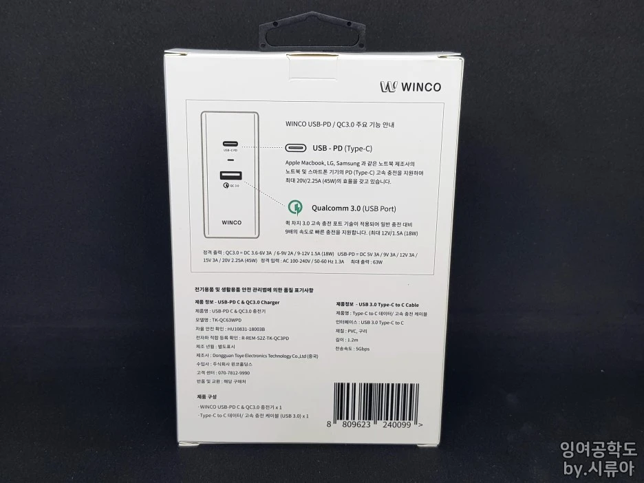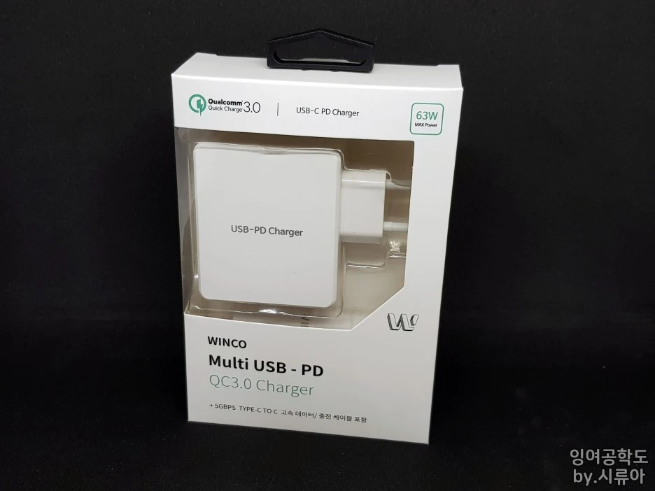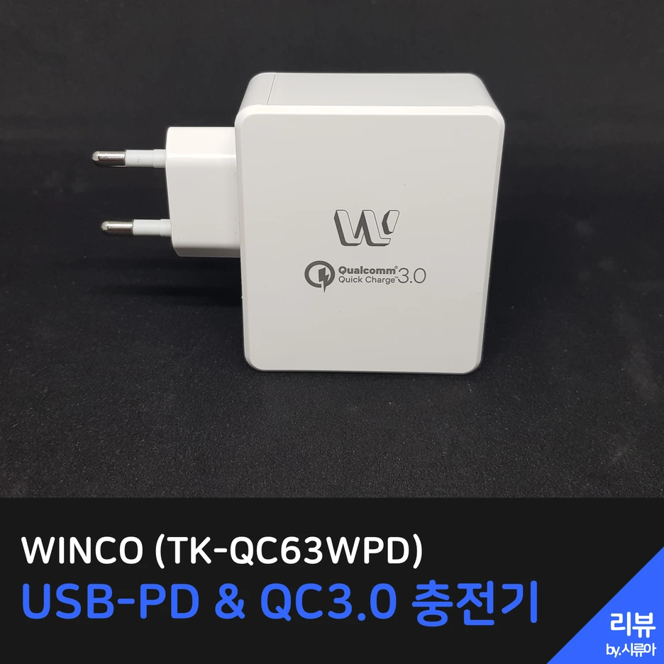 오른쪽 면으로는 USB-PD Charger가, 왼쪽 면으로는 WINCO 로고와 함께 QC3.0이 그려져 있습니다.