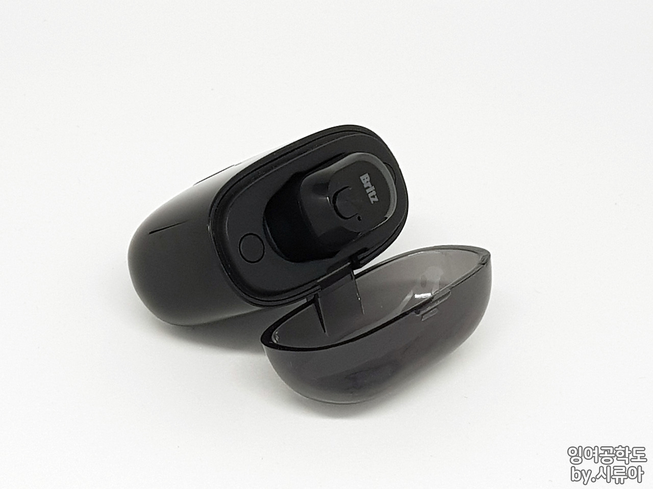 충전 케이스는 전체적으로 둥근 조약돌 디자인이며, 위로는 반투명 커버가, 아래쪽으로는 Micro 5 pin 포트가 있습니다.