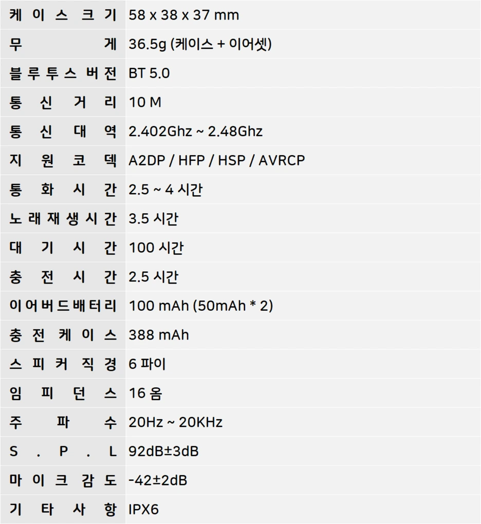 제품 사진과 함께 True Wireless를 크게 적어놓아서 완전한 코드리스 이어폰(TWS 이어폰) 임을 강조하고 있습니다.