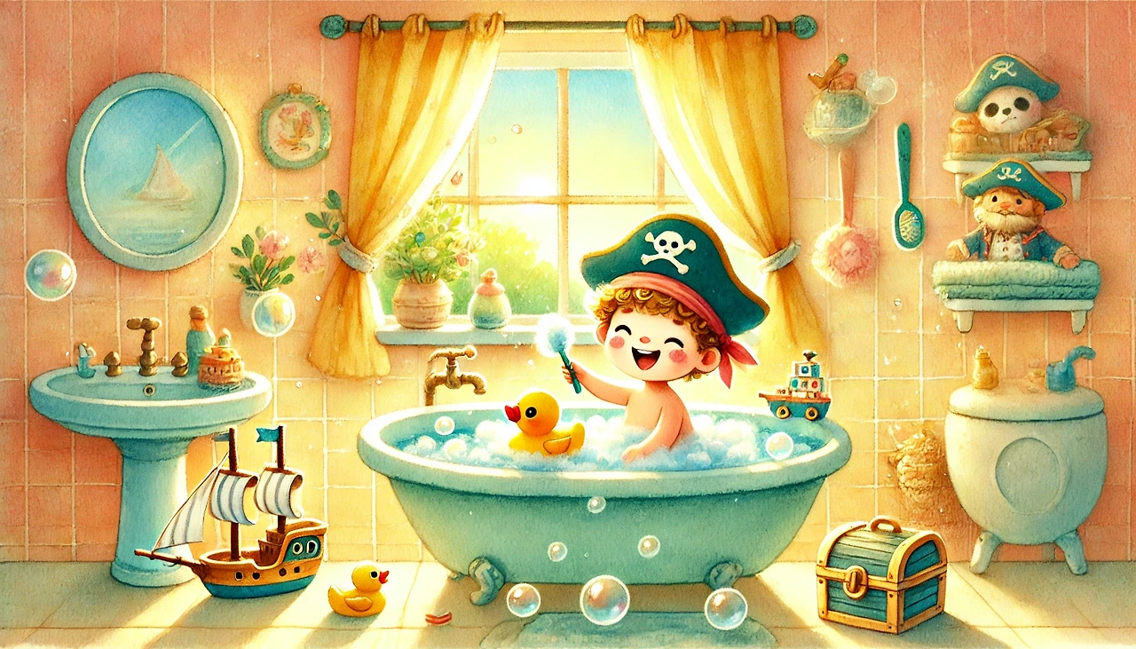 유니와 거니는 욕실에서 물놀이를 하며 깔깔대며 웃고 있었어요. 욕조의 물을 첨벙첨벙 튀기고, 서로에게 물을 뿌리며 신나게 놀던 아이들은 해적놀이를 시작하였어요.