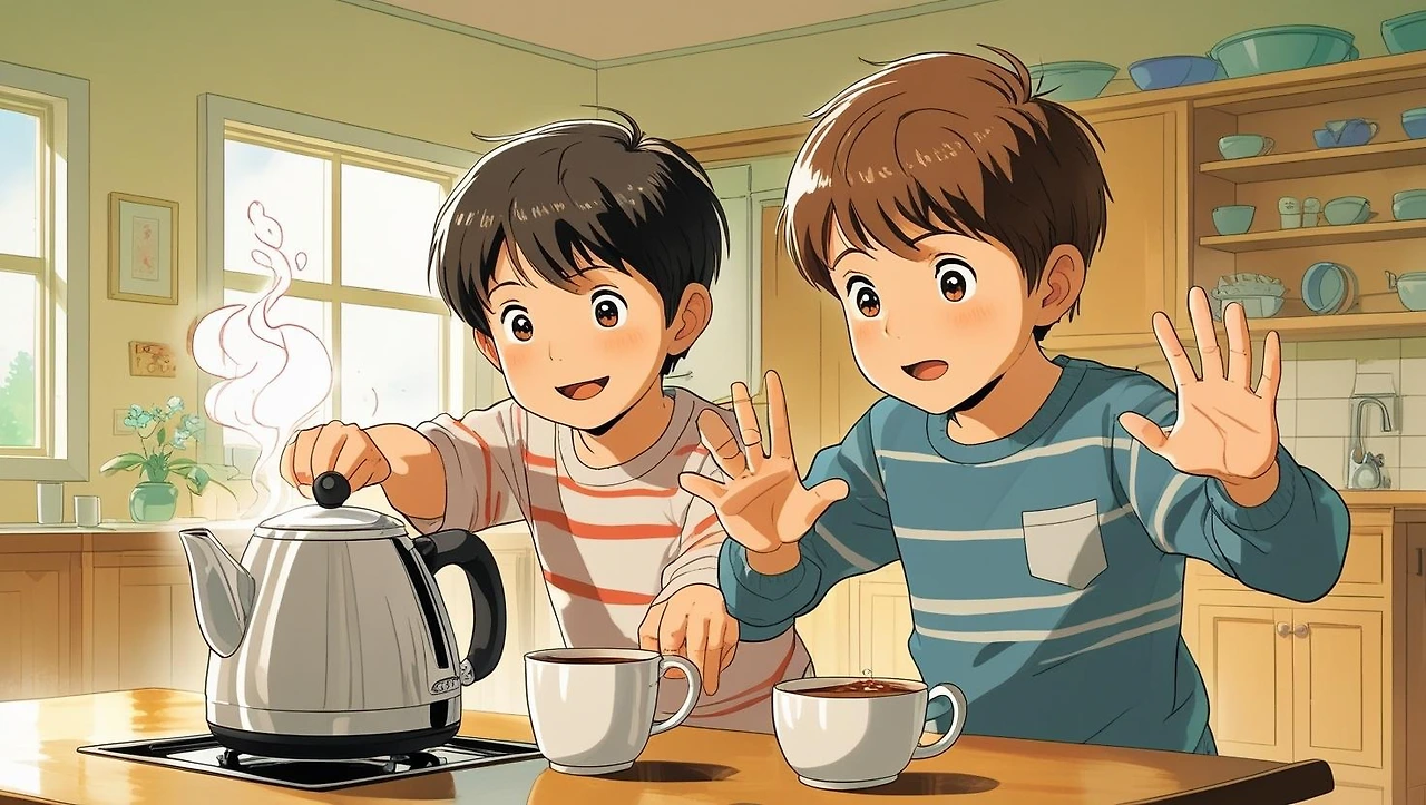 두 아이는 부엌으로 달려갔어요. 엄마는 가스레인지 앞에서 큰 냄비에 카레를 끓이고 있었고, 주전자에는 뜨거운 물이 팔팔 끓고 있었어요.