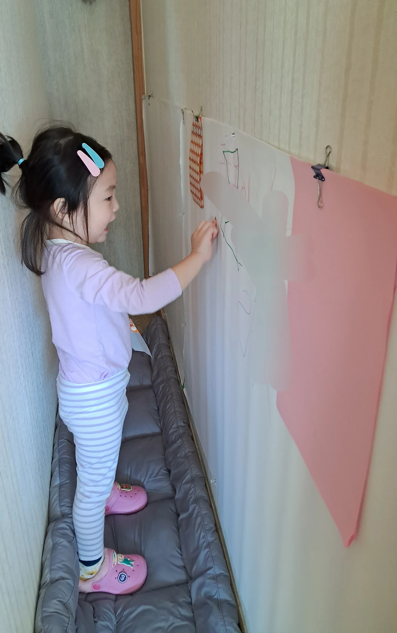 2층 올라가는 계단 아래에 작은 공간이 있어 하얀 벽을 손녀를 위해 내어 주기로 했습니다.