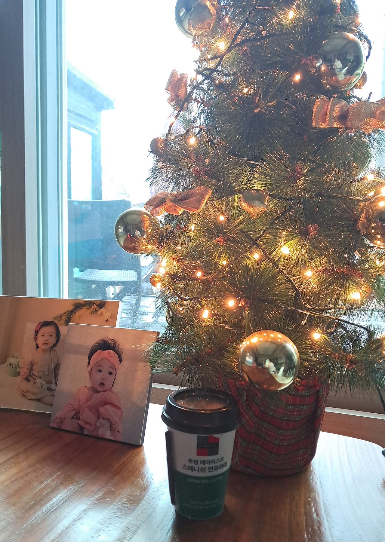 탁자 위 성탄트리에 촘촘히 박힌 전구알들이 깜깜한 시골밤하늘 작은 별들처럼 쉼 없이 반짝이고 있습니다.