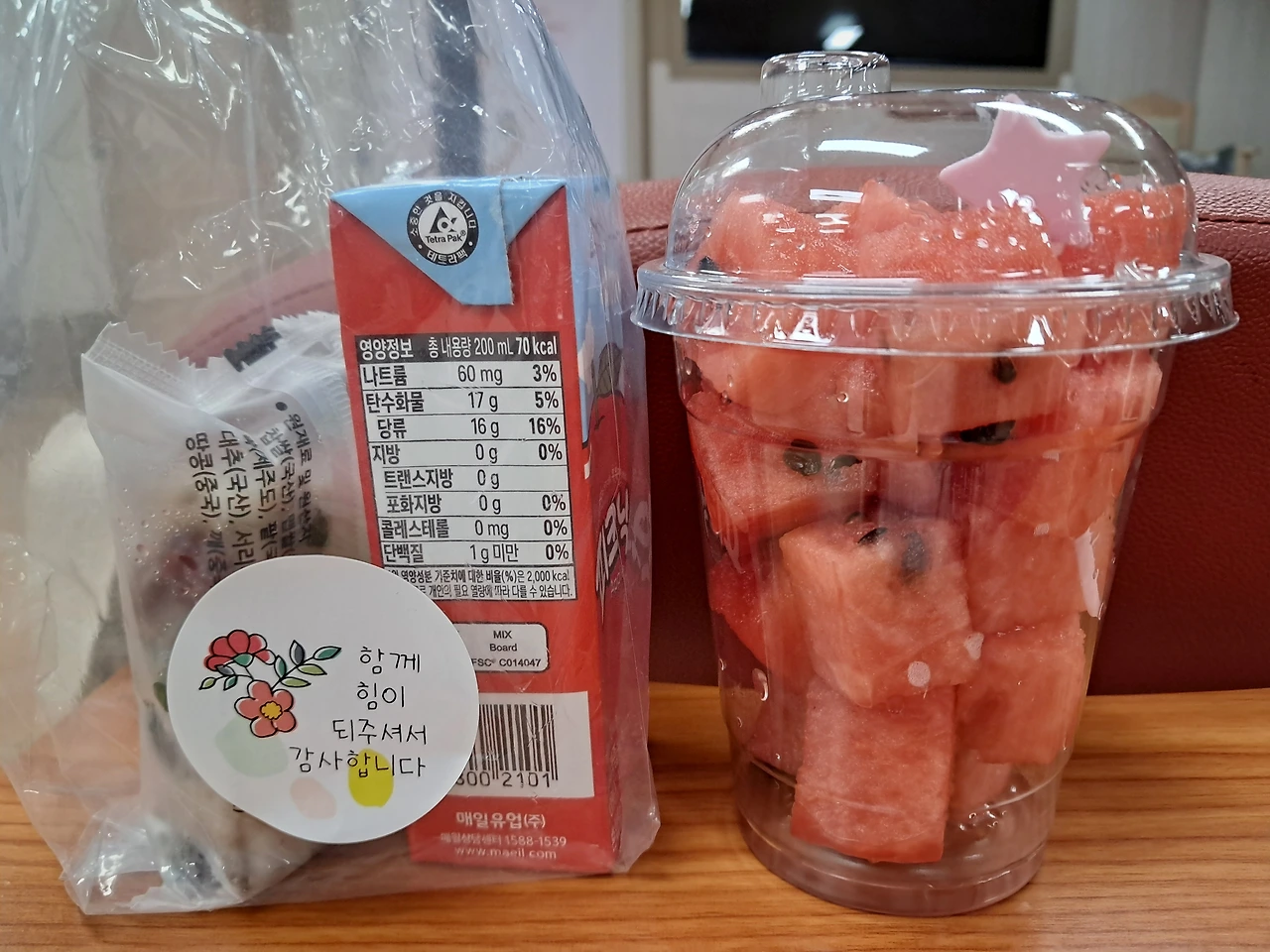 어느 날엔 수박이 투명컵에 한가득 담겨있었어.