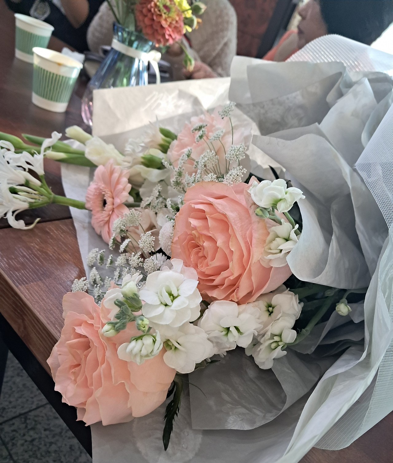 분홍빛 장미꽃과 연분홍색 거베라에 이름 모르는 꽃이 어우러진 참 멋스러운 꽃다발이었지.