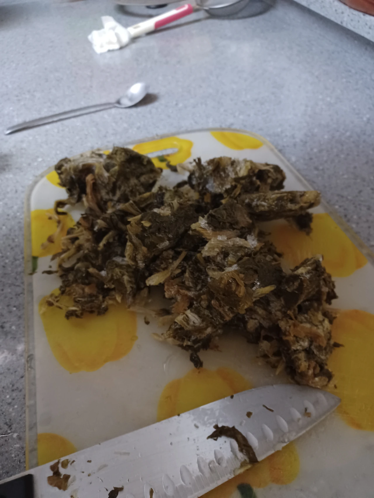ㆍ무청시래기에 된장 약간, 들깨가루와 고츳가루를 넣고 같이 버무려준다.(작년 겨울 말려놓은 무청시래기를 삶아서 냉동고에 얼려놓았었다)