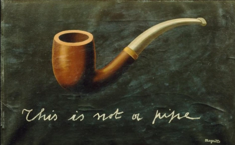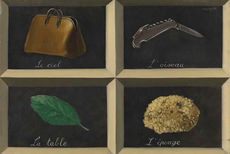 가방을 '하늘', 칼을 '새', 나뭇잎을 '탁자', 꽃을 '스펀지'라고 이름 붙인다. 그림 속 사물과 글자는 서로 어긋나고, 더 이상 서로를 설명하지 않는다.