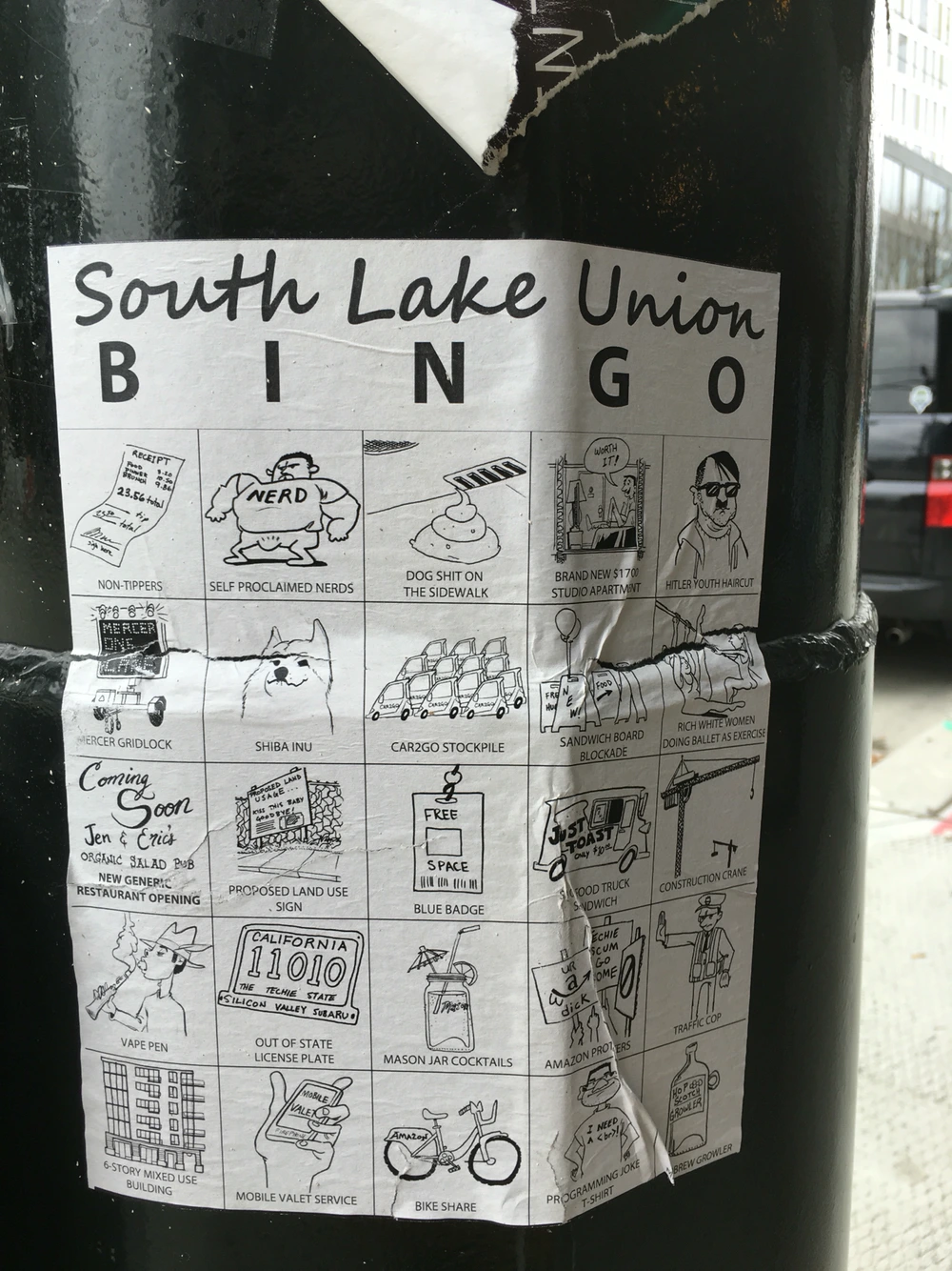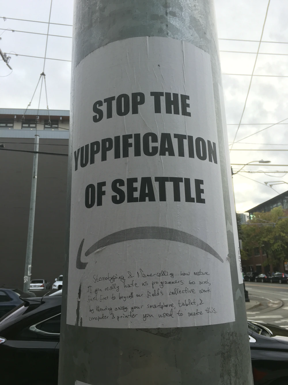 그러다 보니 이 동네 주변을 지나다니다 보면 아마존을 직/간접적으로 '까는' 포스터들이 많이 보입니다. 약 한달 전쯤 간만에 방문했을 때는 벽보들이 많이 제거된 것 같았는데, 지금은 모르겠습니다. 어쩌면 외국인 개발자들 입사철을 맞아 더 다닥다닥 붙었을지도...아래 사진들은 작년 막 시애틀에 도착했을 때 찍은 벽보들 중 몇 개를 고른 것입니다.