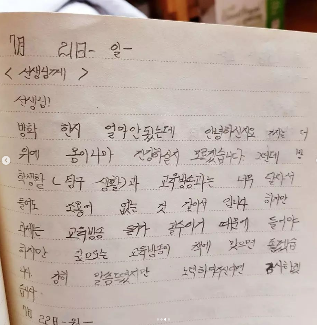아래 일기는 4학년 때 방학숙제를 하던 중에 EBS 방송과 <방학 생활>의 진도나 페이지가 맞지 않아서 분노해서 쓴 듯하다. 담임 선생님의 잘못인지, EBS의 잘못인지는 알 수 없지만. 아이의 분노가 느껴져서 웃음이 나온다.