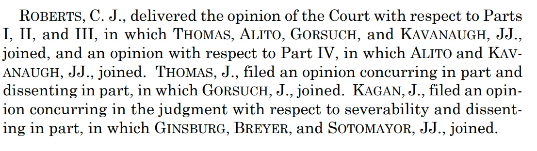 위의 판결문은 장장 105페이지에 달하는 Seila Law LLC v. Consumer Financial Protection Bureau, 140 S. Ct. 2183 (2020) 판결에서 발췌한 것입니다. 한눈에 보더라도 판결문 작성자가 매우 복잡한데요, 로버츠 대법관이 토마스, 알리토, 고르서치, 카바노 대법관이 동참한 가운데 다수의견을 작성하였고, 토마스 대법관이 일부 반대의견을, 케이건 대법관이 긴스버그, 브라이어, 소토마요르 대법관이 동참한 일부 반대의견을 작성했다는 뜻입니다. 동의의견(concurring opinion)은 다수의견의 결론에 동의하지만 조금 다른 논지를 부각하고 싶을 때 쓰는 의견이고, 반대의견(dissenting opinion)은 다수의견의 결론에 반대하는 소수가 쓰는 의견입니다.