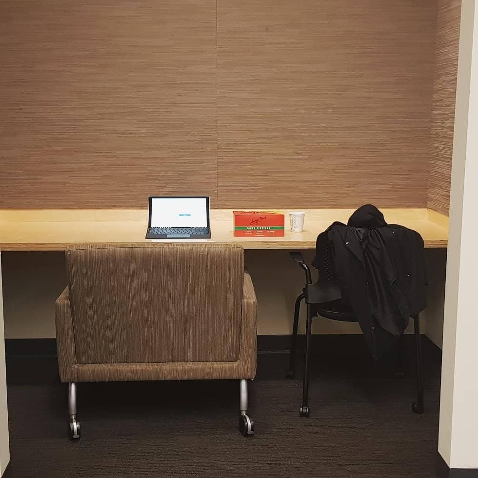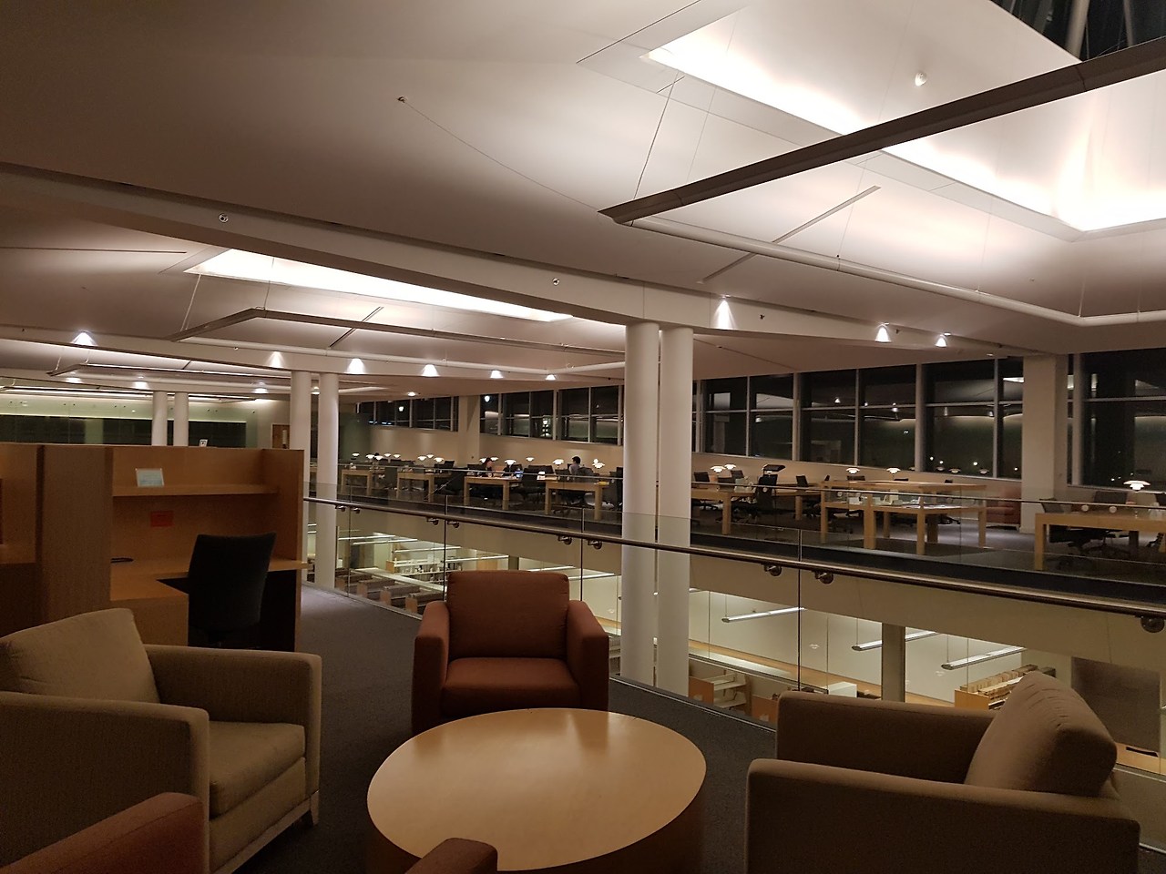 덕분에 나는 어마어마하게 여유로운 법학 도서관을 지닌 건물에서 공부를 할 수 있었다. 우리 학교 법학 도서관은 로스쿨 학생들에게 365일 24시간 개방된다(일반인은 오후 6시까지만 이용 가능한 것 같다). 전자레인지에서 음식을 데워먹을 수 있고, 식수도 항시 공급된다. 빈백도 있기 때문에 여차 하면 노숙도 가능해보인다. 휴대폰 충전기, 노트북 충전기, 독서대(미국인들도 독서대를 쓴다!), 이불 등도 빌려준다.