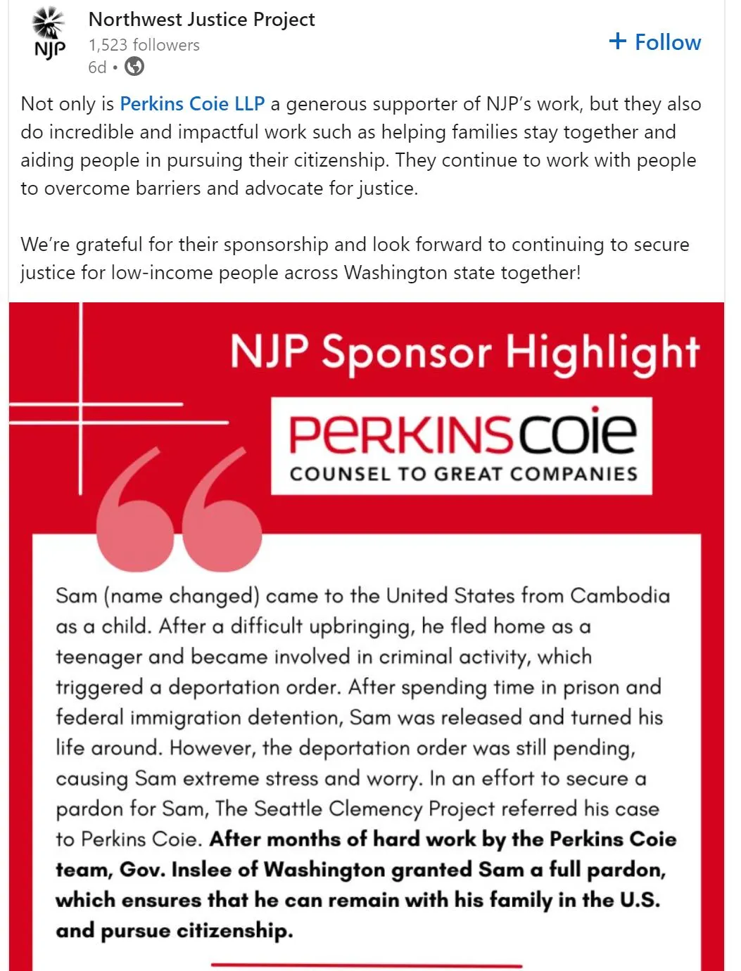 로펌이 시민단체의 활동을 직접 지원하는 일도 매우 흔하다. 듣기로는 대부분의 대형 로펌이 공익소송 전담팀을 운영하며 풀뿌리 단체들과 협력한다고 한다. 공익소송은 당장 이익은 안되지만, 잘하면 로펌의 이름을 전국적으로 알릴 수 있어 장기 투자의 개념이라고. 아래의 사진은 시민단체인 Northwest Justice Project가 대형 로펌 Perkins Coie LLP와 함께 캄보디아 출신 워싱턴 주민에게 내려진 추방명령을 취소하는 데에 성공했다는 내용을 담은 링크드인 포스팅이다.