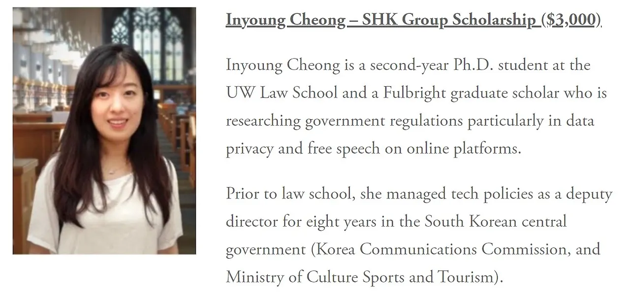 이러한 공익 기여도를 어필하여서 워싱턴 주 한인변호사협회 장학금(3,000불)과 학교 동문회에서 수여하는 Homecoming scholarship(2,000불)을 받는 영예를 누리기도 했다. 특히 한인변호사협회에서 받은 SHK Group Scholarship은 시애틀에서 오래 영업하신 한인 회계사분이 매년 기부를 하면서 생긴 장학금으로 내가 아홉 번째 학생이었다고 했다.