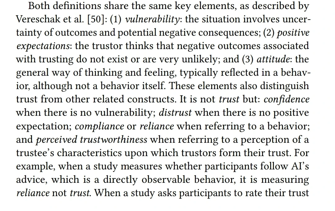 오늘 한 논문을 읽다가 학술적으로 "신뢰"(trust)가 무엇인지를 정의할 때 "취약성"(vulnerability), "긍정적 기대"(positive expectations), "태도"(attitude)가 지표로 들어간다는 내용을 읽었다.