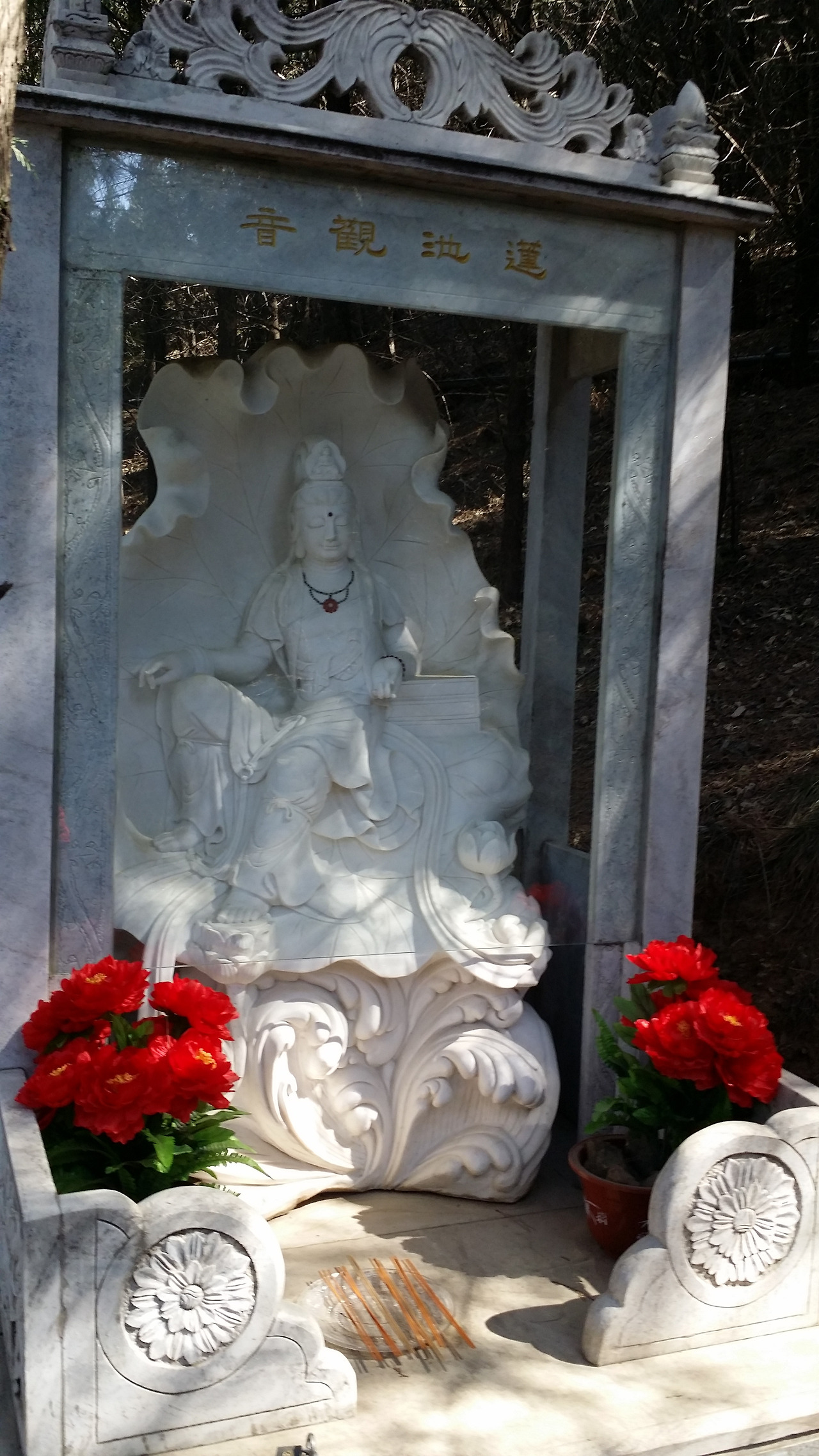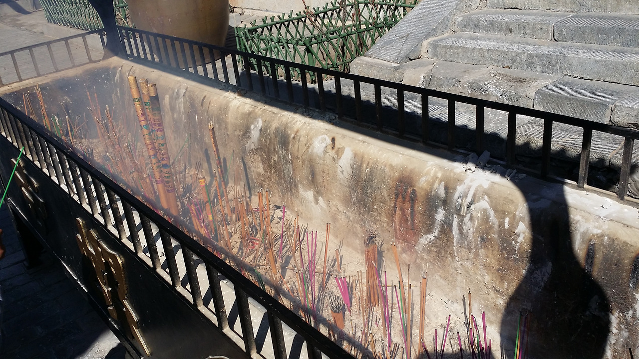 홍라사 패방(牌坊, 중국의 전통적 건축양식의 하나로, 문의 일종. 층층으로 된 지붕, 많은 기둥이 특징)을 지나면 큰 향로가 길 가운데 나타난다. 우리나라도 마찬가지지만 중국의 절도 각기 영험하다는 분야가 있는데, 여기 홍라사는 아기를 갖기 원하는 사람들이 기도하러 오는 곳으로 유명한 절이라고 한다. 특히나 바로 저 향로의 가장 반짝이는 부분(가장 손을 많이 타서 맨들 맨들 해진 것)에 손을 대고 돌면서 아기를 갖게 해달라고 빌면 꼭 아이를 가질 수 있단다. 그래서 나는 향로 가까이에는 가 보지도 않았다.^^