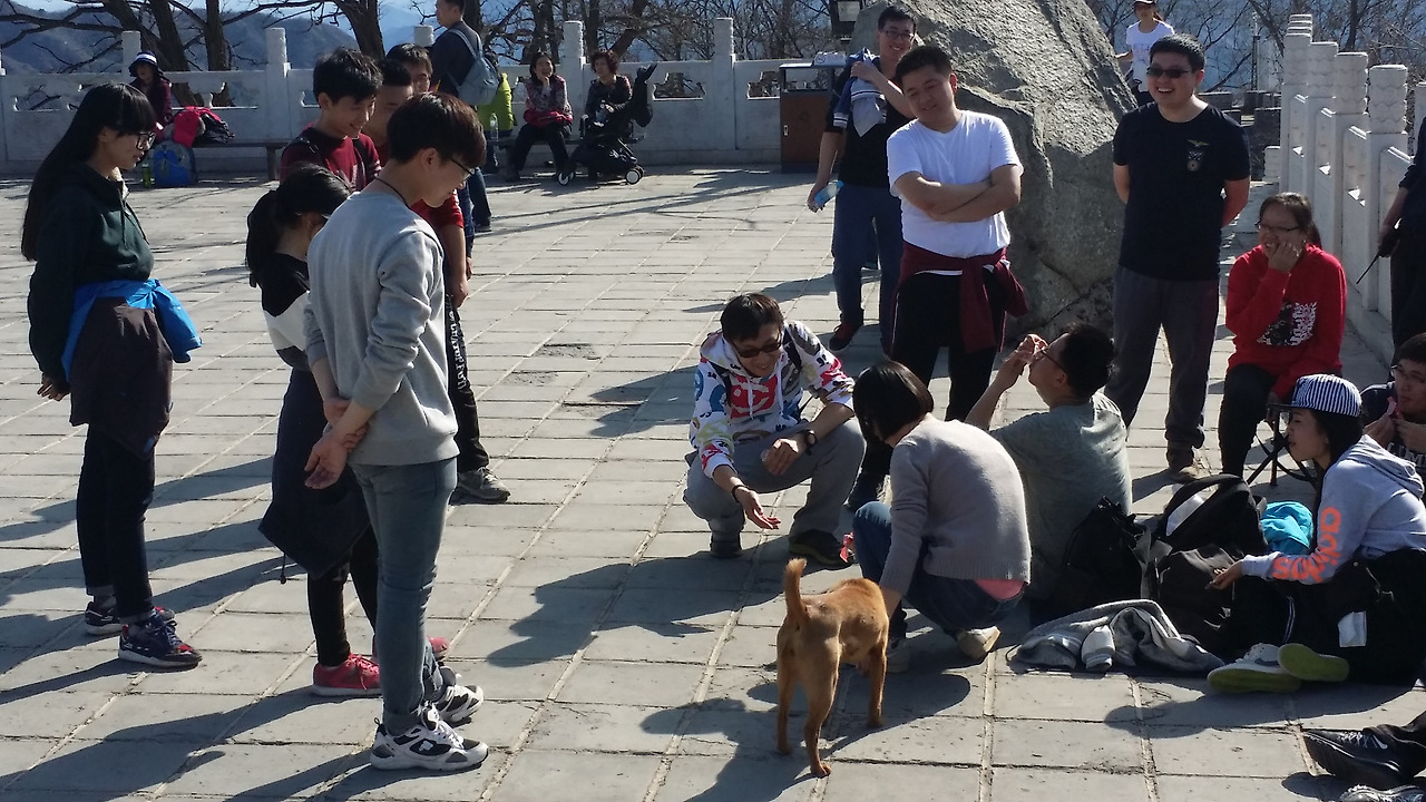 일행을 만나기로 한 장소에서 기다리고 있는데 그늘에 앉아 있는 떠돌이 개를 만났다. 개를 좋아하는 두 딸은 이미 시선 집중. 교생 선생님 중에서도 개를 좋아하시는 분 한 분도 합류. 중국 사람들도 개를 많이 기르는데 사람들이 산책시키는 개들은 하나같이 도도해서 우리한테 눈길 한 번 주지 않았다. 그런데 이 떠돌이 개는 중국에서 처음으로 우리한테 눈길을 주고 애들의 손길도 마다하지 않는 순둥이 개였다. 그렇게 있으니 옆에 앉아 있던 중국 젊은이 한 무리도 개에게 관심을 가지고는 자신들이 먹던 간식을 꺼내 주었다. 떠돌이 개는 한참 동안 사람들 사이를 돌아다니며 자기가 먹고 싶은 간식만, 자기가 먹고 싶은 사람한테만 얻어먹었다.^^ 떠돌이 개 덕분에 중국인들도 우리도 즐겁게 시간을 보낼 수 있었다. 역시 사람 사는 건 다 비슷하다.^^