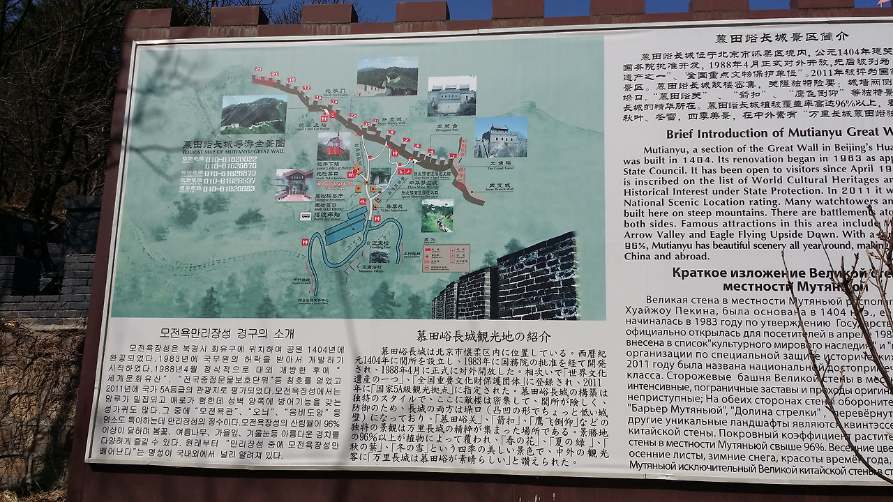 오후 일정으로 찾은 곳은 만리장성 중 한 곳인 무톈위창청이다. 다른 장성에 비해 짧긴 하지만 숲이 울창한 곳에 자리 잡고 있어 풍경이 좋기로 유명하다. 뭐 길이야 아무리 길어봤자 어차피 다 가 볼 수도 없는 것, 무엇보다도 지난번 중국에 왔을 때 다녀온 팔달령보다 사람이 적어 한결 한적했다. 팔달령하면 한참을 뙤약볕에서 걸었던 기억, 이상한 꼬마 열차 같은 것을 타고 정말 탈탈거리며 올라갔던 기억, 힘들게 올라갔더니 사람은 많고, 또 사람도 많은데 굳이 여기저기 파헤쳐서 공사를 하고 있어 더 복잡했던 기억, 그리고 또 힘들게 내려왔던 기억. 그다지 좋은 기억이라기보다는 나쁜 쪽에 가까운 기억들이 많았는데 여기는 입구부터 깨끗하고 여유로웠다.