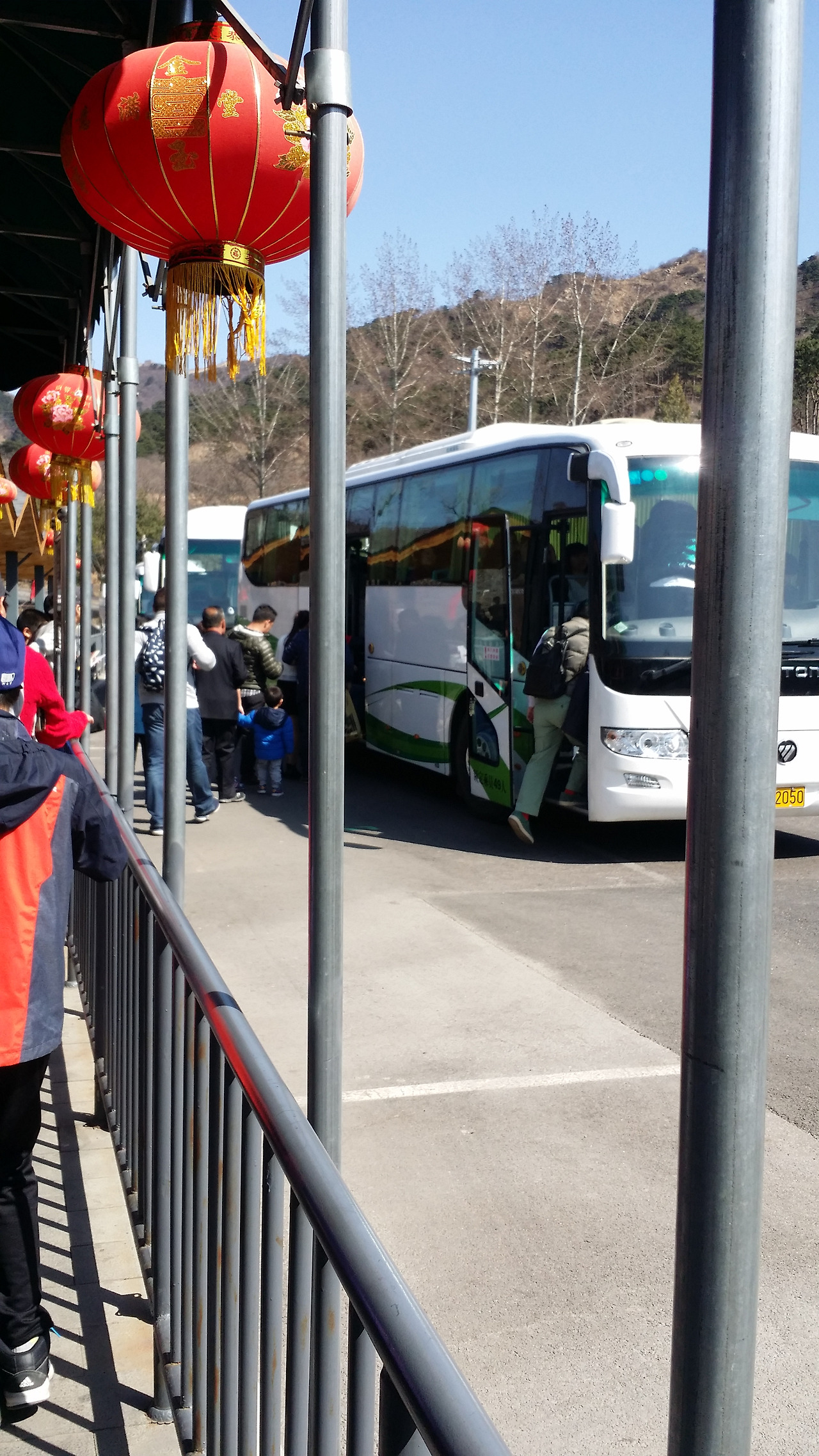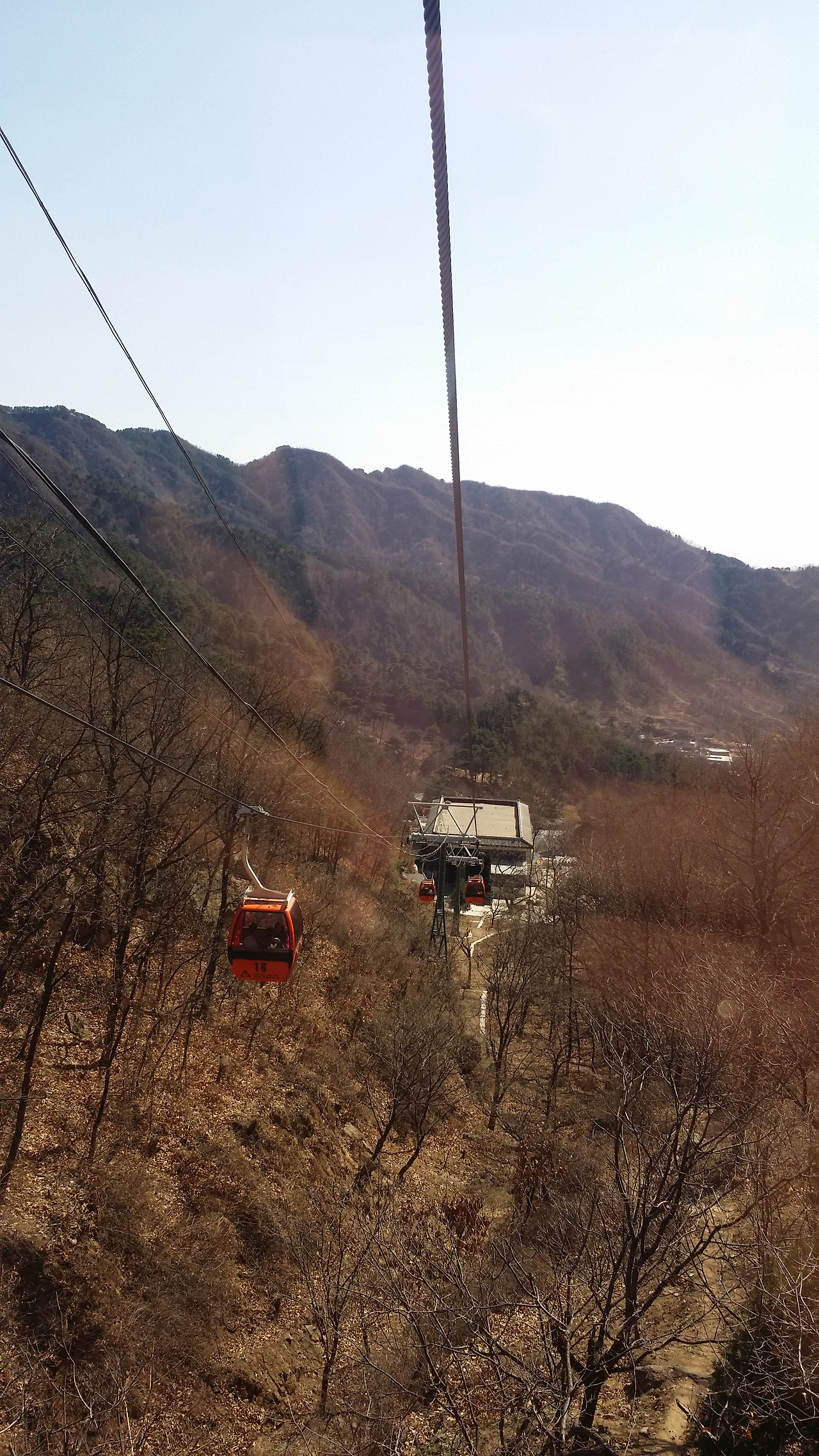 셔틀버스를 타고 케이블 카 타는 곳까지 이동을 해야 한다. 원래는 모든 차들이 케이블카 타는 곳까지 올라갈 수 있었으나 새롭게 단장을 하면서 셔틀버스를 이용하게 했단다. 그 이유는 고용을 창출하기 위해서. 중국은 아직도 많은 사람들을 고용하기 위해서라면 조금 복잡하고 비효율적인 방법이라도 고수하고 있다. 대표적인 예가 버스 안내원이다. 처음엔 버스 안내원을 보면 하는 일도 없이 앉아 있기만 하네 싶었다. 그런데 한 달 정도 지난 지금 보면 안내원은 참 많은 일을 한다. 할아버지, 할머니 표도 확인하고, 돈을 내면 거스름돈도 챙겨주고, 정류장에서 수신호로 버스 정차를 알려주고, 문 닫는 시점을 알려주고, 아이들과 노인들이 위험하지 않게 자리에 앉았는지 확인하고. 심지어 어떤 안내원은 앉을 자리까지 정해주는 사람도 봤다.^^ 그래서 이제 버스 안내원을 보면 참 마음이 따뜻해지는 느낌이랄까? 그런 이유에서 마련된 셔틀버스를 타고 케이블카 타는 곳으로 이동해서 케이블카를 타고 올라가자 장성의 모습이 눈에 들어오기 시작했다. 말로만 듣던 만리장성을 직접 눈으로는 처음 보는 두 딸들은 연신 감탄을 하며 장성의 모습을 확인하기 바빴다.