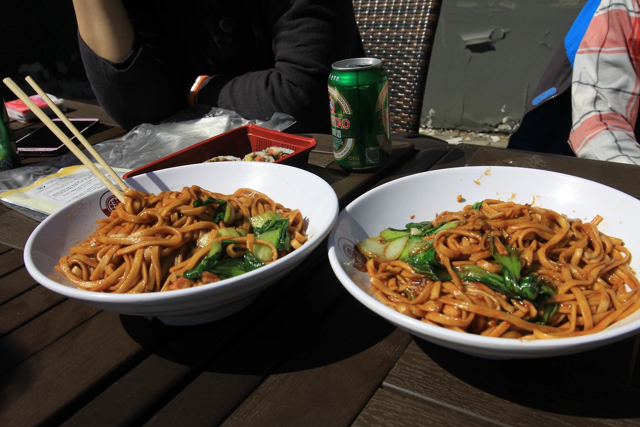 입구를 들어서면 양쪽에 기념품 가게와 식당들이 몇 개 있다. 그다지 다양한 음식들을 파는 것 같지 않고 문을 닫은 식당들도 더러 있어서 입구 쪽에 있는 버거킹만 사람들로 붐비는 듯했다. 특히 다른 곳에서는 잘 볼 수 없었던 서양인들이 많이 눈에 띄었다. 우리도 야외 테이블을 내놓은 가게에 앉아서 점심을 해결했다. 중국은 한국과 다르게 다른 곳 음식을 가지고 와서 먹어도 그다지 제재를 가하지 않는다. 그래도 좀 미안한 마음에 볶음밥이랑 국수 하나를 시켰는데 우리에게 나온 음식은 자장면 두 그릇이었다.^^ 아, 언제나 제대로 우리의 의도를 전달할 수 있으려나......