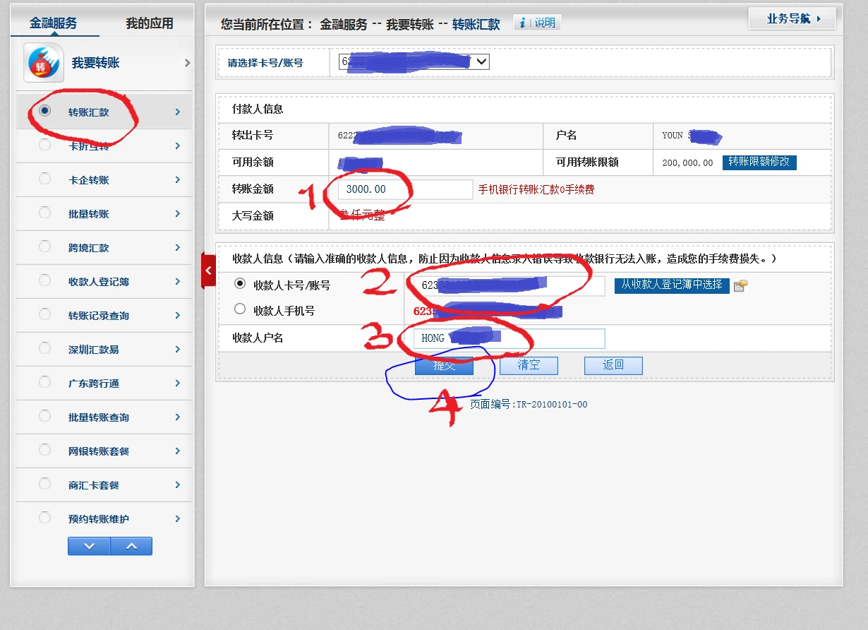 다음으로 펼쳐지는 화면. 왼쪽 아래의 수많은 이체 메뉴 중 나는 첫 번째만 쓸 것이다. 해석하자만 '이체송금' 정도. 그리고 1번에 보낼 돈의 액수를 적고 다음 2번에 돈을 보낼 계좌번호를 쓴다. 중국은행 계좌번호는 무려 19자리나 된다. 그걸 치는데 손이 덜덜 떨려 자꾸만 틀린다. 난 개학을 앞두곤 꼭 무슨 일이 생겨 학교에 가지 못할 상황이라 학교에 전화를 해야 하는데 전화번호를 자꾸 틀리게 눌러 전화를 하지 못하고 당황스러워하는 악몽을 꾸곤 하는데, 앞으로는 계좌번호 틀리는 악몽을 꿀 듯 싶다.^^ 다시 확인 또 확인. 그리고 3번에는 계좌의 주인 이름(여권 상의 이름과 똑같아야 함)을 치고 4번을 누른다.