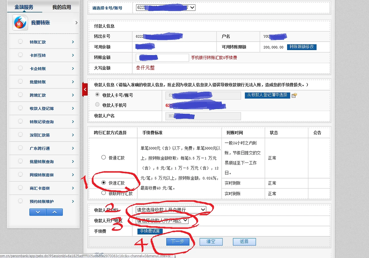 그럼 나오는 화면 위의 내용은 앞 입력 내용을 확인하는 내용이고 그 아래 1번을 누르고 그다음 2번에는 보낼 계좌의 은행을 검색해서 찾아야 넣어야 한다. 그런 다음 3에는 그 은행의 지점명을 검색해서 넣어야 하는데 여기서 또 한참 헤맸다. 중국은 같은 은행이라도 지점이 다르면 다른 은행으로 취급한단다. 그래서 돈을 보낼 계좌가 그 은행의 어디 지점인지까지 알아야 한다. 그리고 검색해서 일치하는 지점명을 찾아 넣어줘야 한다. 도대체 무슨 순서로 정렬되어 있는지 알 수도 없는 (예를 들어 왕징 내에 있는 교통은행이라면 교통은행 왕징00지점이라고 불릴 테니 그 뒤로 쭉 나열되어 있음 좋으련만 그렇게 정렬되어 있지가 않다.) 지점명들을 일일이 검색해서 찾으니 내가 찾는 지점은 9페이지 끝에서 발견할 수 있었다. 인터넷 뱅킹하는데 끈기가 필요하단 걸 중국 와서 깨닫는다. 그렇게 찾아서 지점명까지 확실히 넣어 준 뒤 4번 누르기.