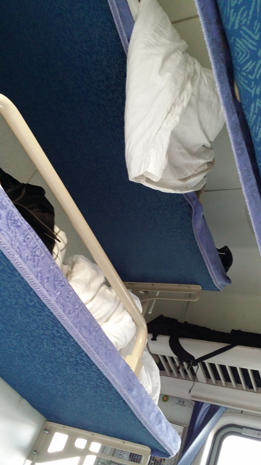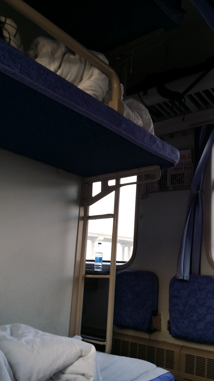 아주 개방적인 중국 기차 6인실. 문이 아예 없다. 사람들 왔다 갔다 하는데 그냥 자야 한다. 그래도 맨 아래칸은 사람이 앉아 있을 수 있는 높이이나 둘째 칸은 엎드려서 올라가야만 하고, 셋째 칸은 포복 수준으로 올라가야만 하는 높이다. 그래서 위칸 사람들은 복도에 있는 접이식 의자에 앉아 있다가 잠잘 때만 자기 자리에 올라가서 잔다. 어쨌든 처음 보는 사람들과 위, 아래, 옆에서 어울려 자는 것, 참 묘한 느낌이다.^^ 그래도 난 한 번 겪어 봤기에 예상치 못한 것은 아니었는데 중국 와서 처음으로 6인실 기차를 탄 일행들은 기차 타기 전 일부터 시작해서 악몽 같은 여행의 시작이었단다.^^