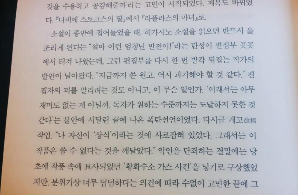 결국 내 결론은 이 작품이 히가시노 게이고의 모든 미스터리를 집대성한 작품이라는 타이틀은 적확하진 않지만 흥미 있고 내용도 좋은 작품이라는 것이다. 그래서 누구나 한 번쯤은 읽어보면 좋을 소설임에는 틀림없다.