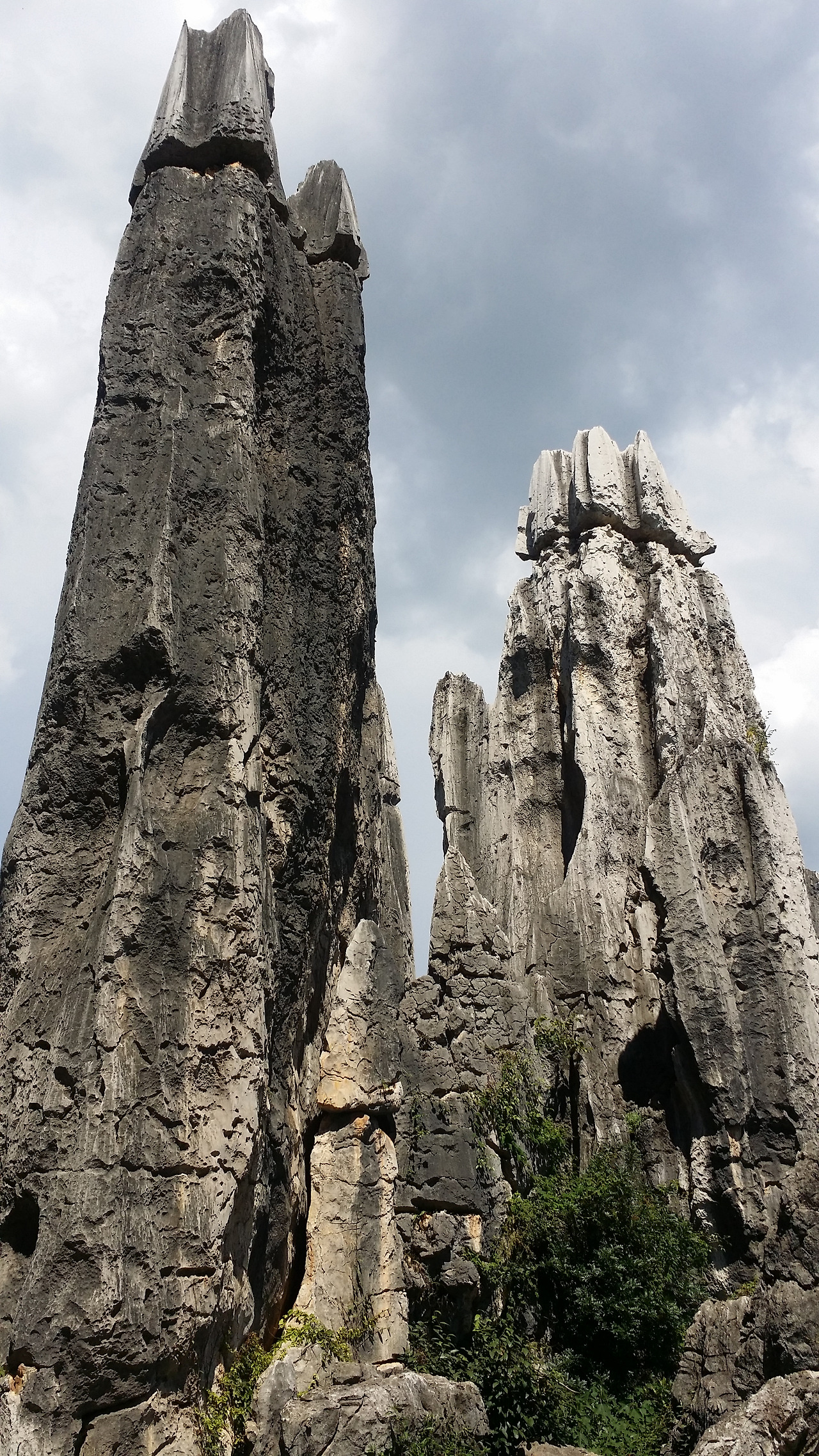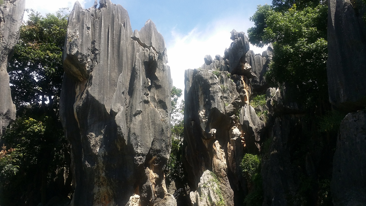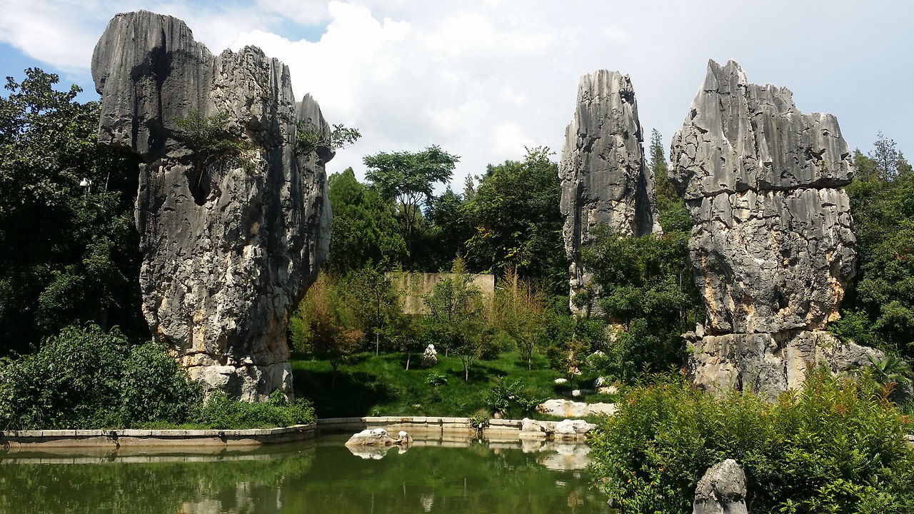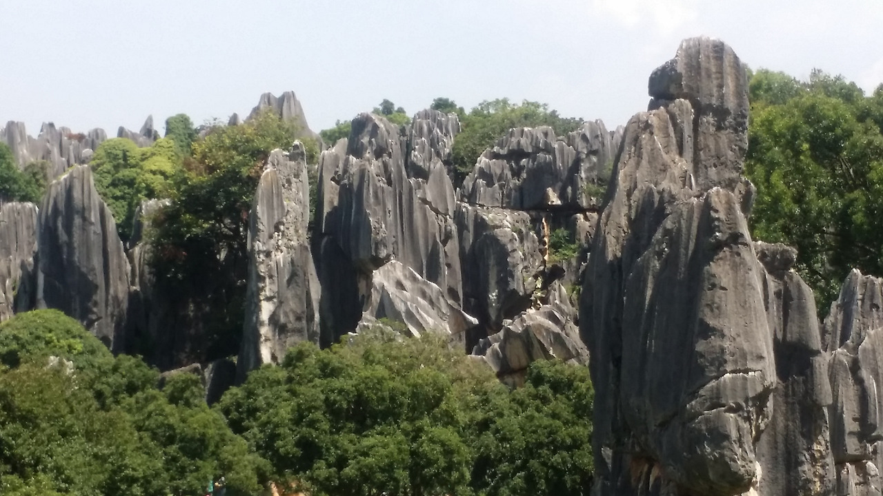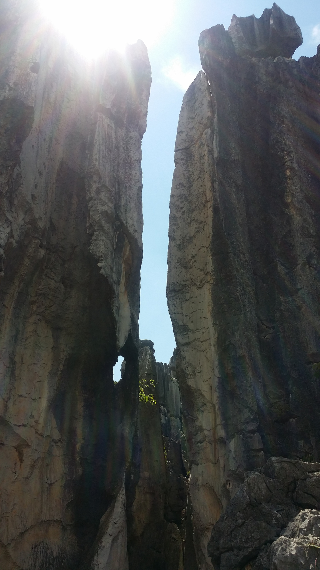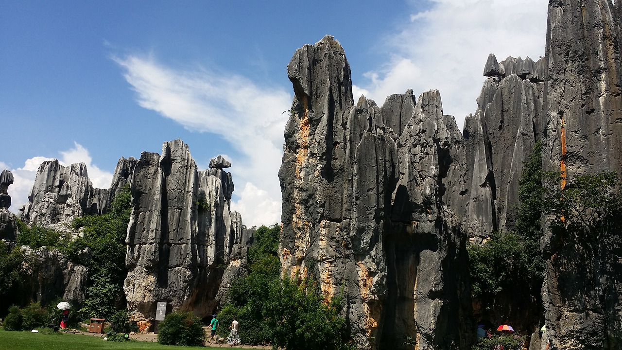 오후에 간 곳은 윈난스린(云南石林, 운남석림)이다. 카르스트 지형 때문에 형성된 기암괴석으로 이루어진 돌 숲이다. 원래 바다였던 이 곳이 육지가 되면서 석회암들이 드러나게 되었고 오랜 시간을 거치면서 지금의 날카로운 모습을 갖게 되었단다. 우선 들어가면 돌 숲이 보이는 것이 아니라 엄청나게 큰 호수가 보인다. 이 곳의 규모는 어마어마(총면적 350㎢)해서 숲과 숲 사이를 움직일 때는 그 안에서 움직이는 전기차를 타고(절대로 걸을 수 없는 규모임) 움직여야 한다. 제대로 자세히 구경하려면 3시간 이상을 잡아야 한단다.(내가 보기엔 하루 종일 걸릴 것 같다.)