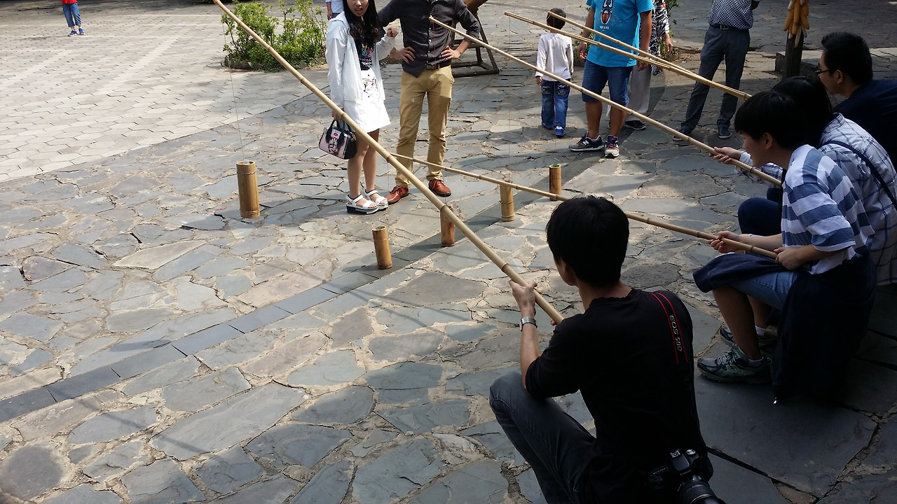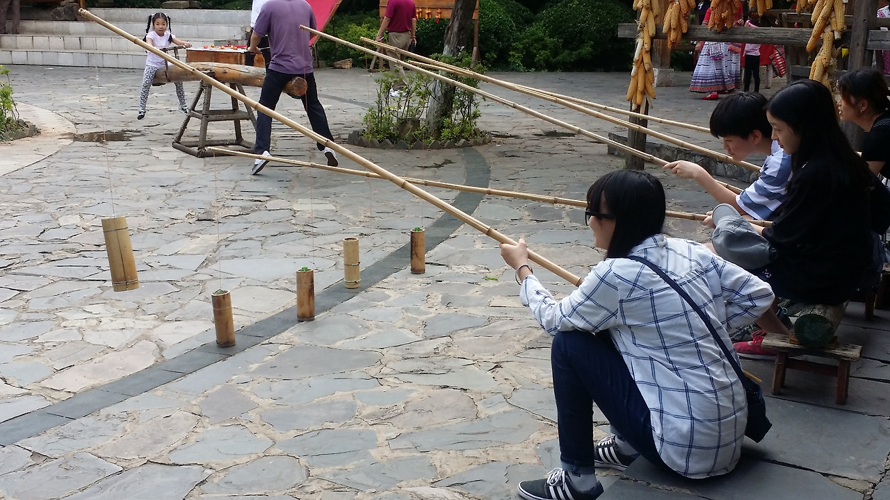 묘족 낚시 놀이에 푹 빠진 일행들. 런닝맨에서 게임으로 봤던 것 같은데 낚싯대 줄 끝에 약간 구부러져 있는 못이 매달려 있다. 그것을 병 입구에 잘 조준해서 집어넣은 후 살살 들어 올리면 병 주둥이에 못이 걸려 병이 들리는 원리이다. 어쩜 이렇게 소소한 체험을 하게 만들어 놓은 것도 우리나라 민속촌 하고 비슷할까.