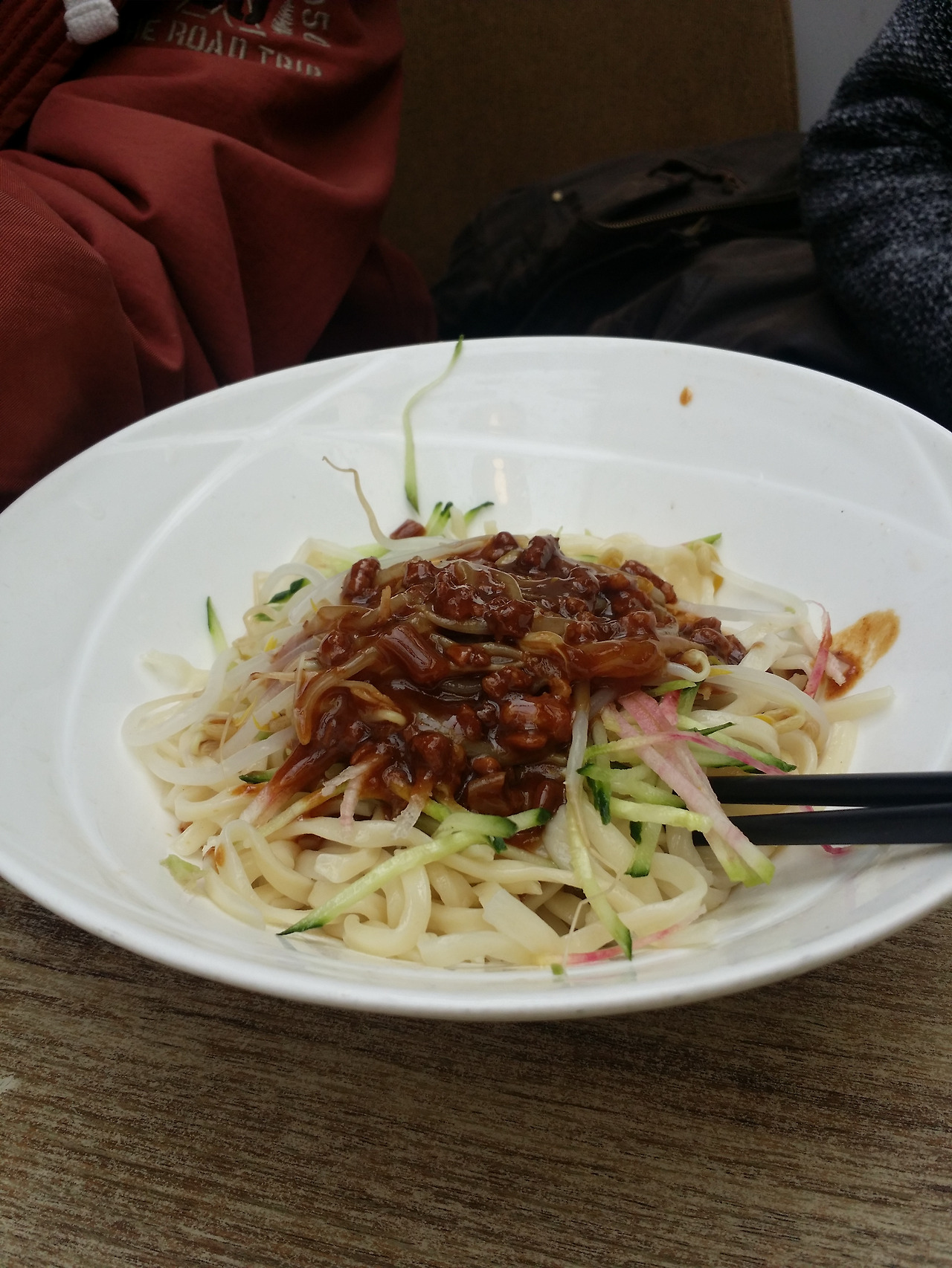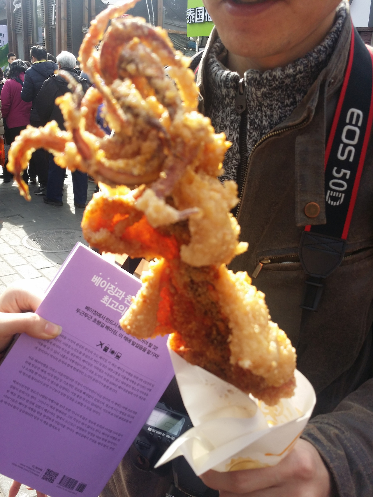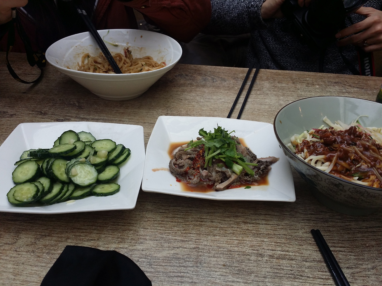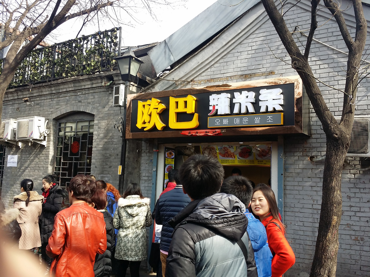사람에 밀려서 자세히 구경하는 것은 포기하고 배고픔을 해결하기 위해 우리의 목표인 꼬치집을 찾기 위해 인파를 헤치며 열심히 골목길을 찾아 나갔으나 한참을 걸어서 도착한 그곳엔 입구가 굳게 잠겨 있었다. 오늘만 쉬는 날인 건지, 아님 아예 문을 닫은 건지 막막함에 배는 더 고파오고, 그때 애들 아빠가 줄 서서 사온 오징어 튀김. 지금까지 먹어 본 중국 음식 중 가장 최고의 음식으로 등극이오. 그리고 아무렇게나 찾아 들어간 중국 자장면 집. 중국 자장면은 첫맛은 '음, 이게 무슨 맛?'이지 싶은데 먹다 보면 자꾸 먹게 되는 오묘한 맛이랄까? 한국 자장면보다 맛있지는 않지만 자극적이지 않은 맛. 특히 반찬으로 시킨 오이 볶음이 생각보다 맛났다. 집에 가서 한 번 도전해봐야겠다.