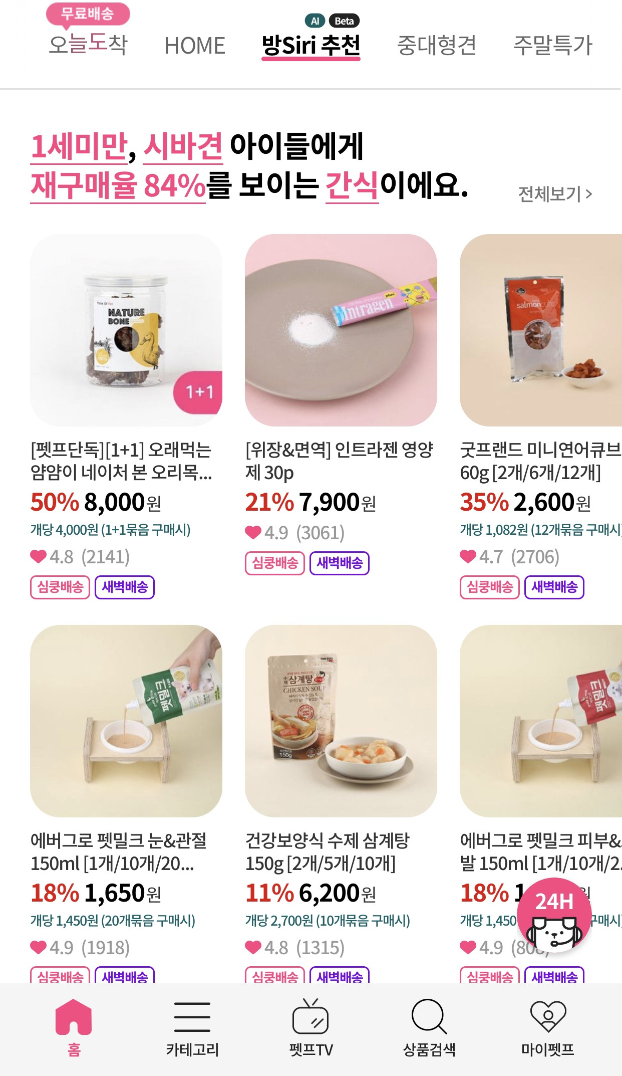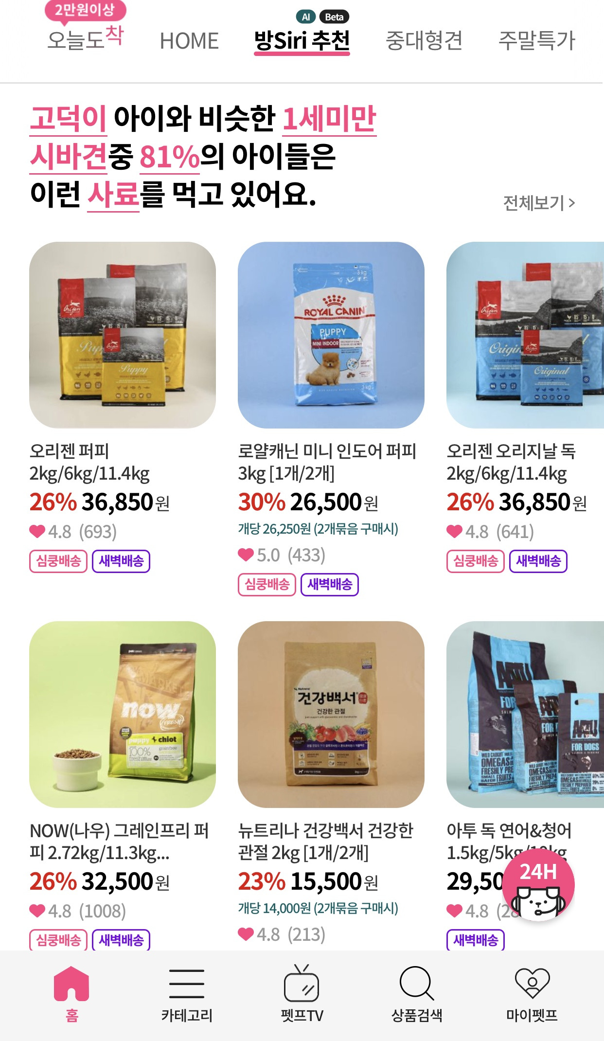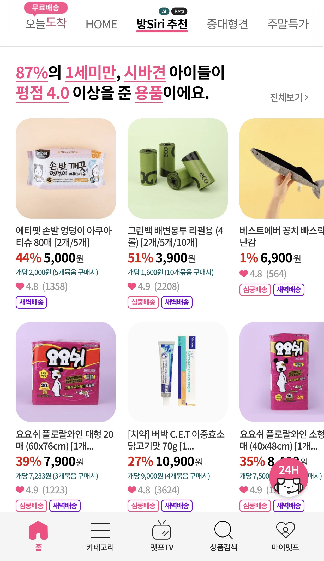 펫프렌즈를 사랑하게 된 이유 두 번째. 데이터를 활용하여 서비스를 고도화하고 있기 때문입니다. 펫프렌즈에는 '방Siri추천'이라는 메뉴가 있습니다. 마치 애플의 시리(siri)를 떠올리게 합니다. 어느 정도 연관이 있습니다. 인공지능을 이용해 상품을 추천하는 기능입니다.