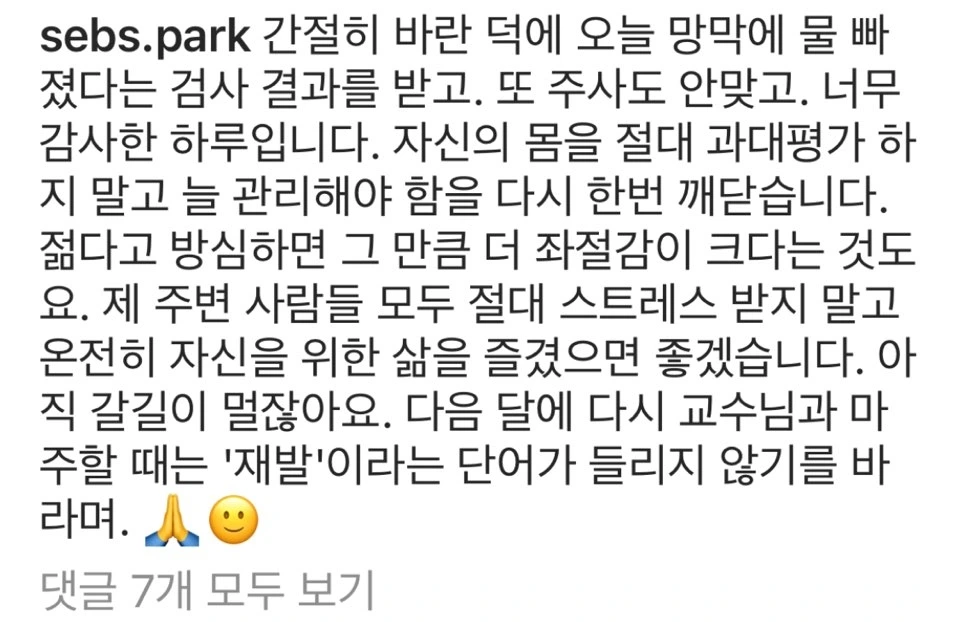최초 진단 이후 안구에 직접 놓는 4~5회의 주사치료를 통해 망막 주변의 신생혈관들은 모두 제거되었으며, 이 글을 쓰고 있는 현재까지 1년이 넘게 증상이 재발하지 않은 상태로 잘 유지하고 있습니다. 물론 작은 후유증은 남았지만, 다른 이들과 같이 일을 할 수 있고 일상을 누릴 수 있음에 너무 감사합니다.