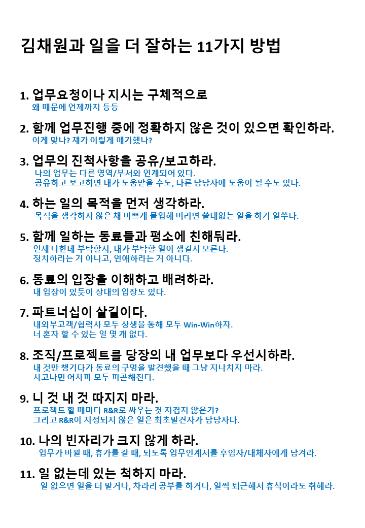 끝으로 우아한 사람들(배달의 민족)이 한 때 유행시켰던 '송파구에서 일 잘하는 방법 11가지'를 내 버전으로 작성해 회사 책상에 붙여 놓은 것을 공유하겠다. 이름은 '김채원과 일 잘하는 방법 11가지', 앞으로 나와 함께 일하게 될 모든 사람에게 공유하고 내가 지키고자 하는 내용이다.