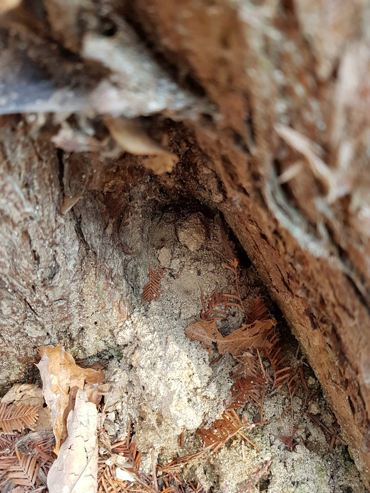 잘 보면 메타세쿼이어 나무 등걸 밑에 모래깔때기를 찾을수 있습니다.