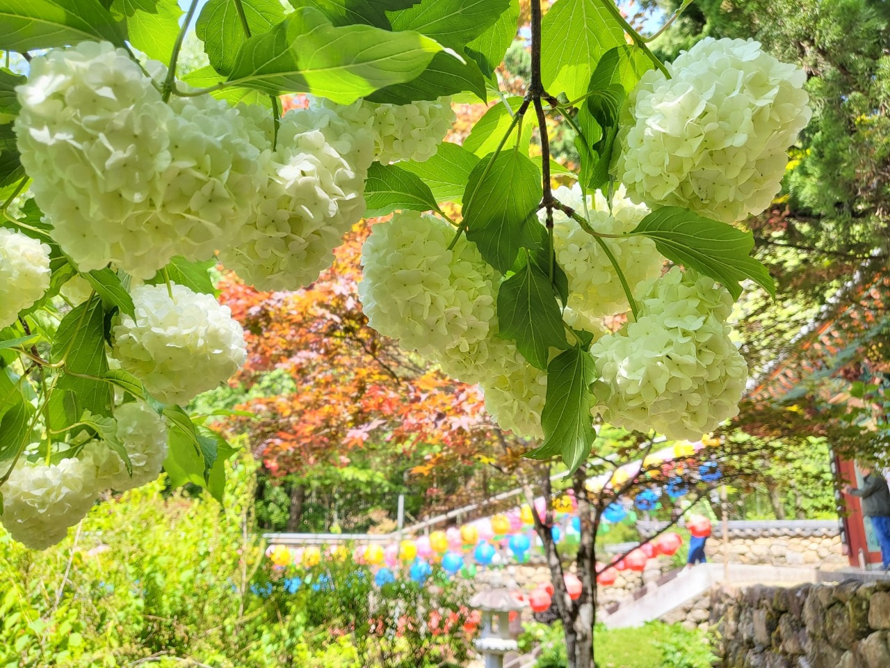 그렇게 십 여분이나 걸어갔을까. 수풀이 무성히 자란 뒤쪽에 작은 사찰이 모습을 드러냈다. 구층암은 암자라기보다는 법당이 있는 사찰의 형식을 갖춘 곳이었다. 작은 뜰에 커다란 불두화들이 만발했다. 물을 잔뜩 머금은 하얀 꽃송이에 연두 한 방울이 퍼져나간 듯 상큼한 불두화는 소박한 꽃이다. 커다랗고 하얀 불두화 사이에서 연분홍 참꽃이 화려함을 자랑하고 있다. 천불전의 부처님들을 마주하고 삼배를 올린다. 불두화처럼 둥글고 뽀글뽀글한 머리모양을 한 귀여운 부처님들은 입 꼬리를 살짝 올리고 나를 내려다본다. 천분의 관객 앞에서 나는 정성을 다해 무릎을 꿇고 이마를 땅에 대고 절한다. 소박하고 순한 관객들이 지켜보는 불단 아래에서 두 무릎을 가슴에 당겨 몸을 둥글게 말고 나는 조용히 있다. 나는 조금은 외롭다. 세상으로부터 멀리 떨어져 있다는 외로운 나의 감정은 사치스럽다. 세상으로부터 너무 가깝지도 않고 멀지도 않은 거리의 공간에서 나는 외로운 채로 조금 더 머무르고 싶다. 참꽃 속으로 깊숙이 머리를 들이밀고 꿀을 빠는 호박벌의 분주한 날개 짓 소리가 산사의 정적을 깨고 있다.