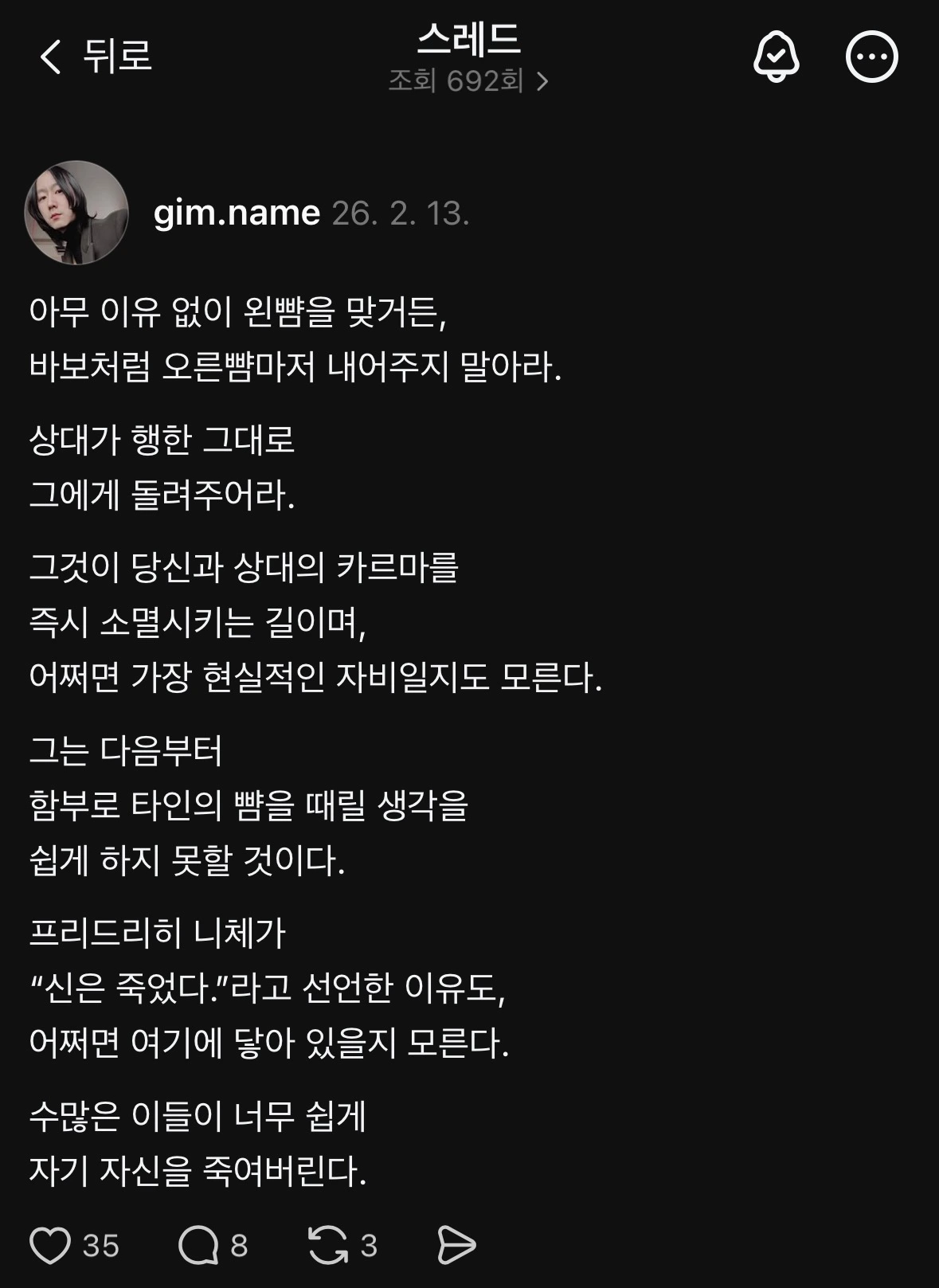 글 속의 저는 평등과 중도를 말하지만, 실제의 나는 훨씬 괴팍하고 고집스러우며, 때로는 스스로 '악랄하다'고 느낄 만큼 서늘한 구석이 있습니다. 부처님께서 세속을 끊기 위해 선택한 삭발이라는 방편보다, 어쩌면 저의 이 '글쓰기'라는 방편이 훨씬 더 극단적이고 위태로운 줄타기일지도 모르겠습니다.