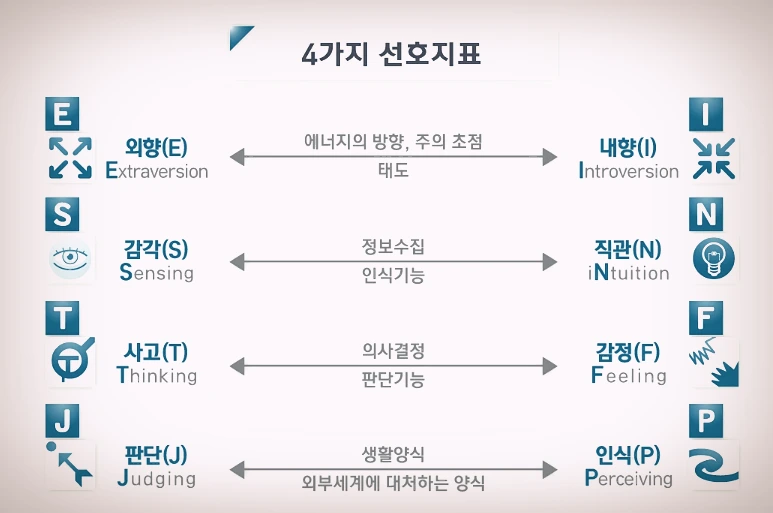 선호지표 8가지는 외향과 내향, 감각과 직관, 사고와 감정 그리고 판단과 인식을 말하는데, 이 중 어느 쪽을 선호하는가에 따라 아래와 같이 4가지로 분류하고 총 16가지 성격유형으로 나눌 수 있다.