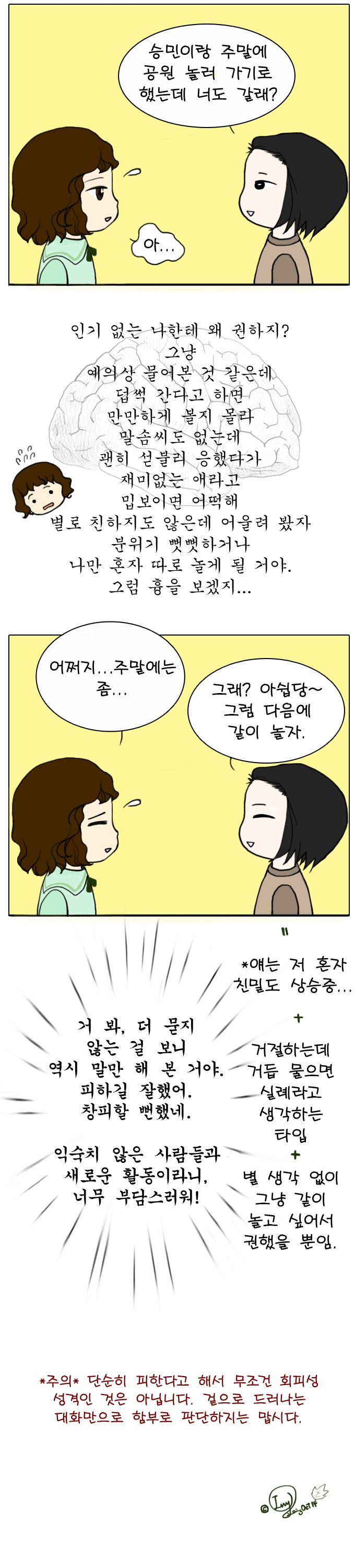 -친밀해진 후에도 창피나 조롱이 두려워 스스로를 잘 드러내기 힘들다.