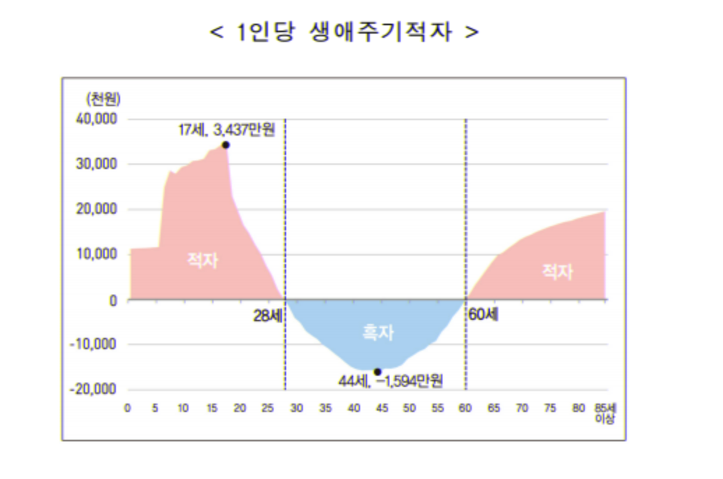 중년은 가장 많이 일하고, 소득이 높은 연령대이기도 합니다. 한 사람은 태어나 죽는 날 까지 생애주기 동안 흑자보다 적자를 더 많이 냅니다. 살면서 적자를 내는 동안에는 사회와 가정이 비용을 대신 감당해줍니다. 유일하게 흑자를 내는 시기는 28세부터 60세까지인데 이들이 사회적 비용을 기꺼이 감수해주는 것입니다. 젊은 부모가 아이를 양육하고 성인이 된 자식이 부모를 부양하는 것, 우리가 일하는 동안에 낸 세금이 각종 복지로 쓰이는 것이 예입니다.
